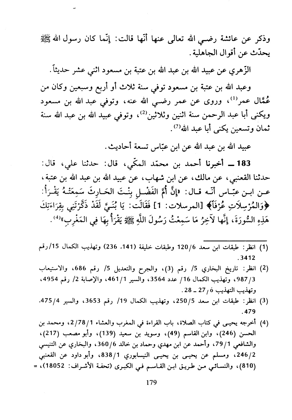 183 - أَخْبَرَنَا أَحْمَدُ بْنُ مُحَمَّدٍ الْمَكِّيُّ، قَالَ: حَدَّثَنَا عَلِيٌّ، قَالَ: حَدَّثَنَا الْقَعْنَبِيُّ، عَنْ مَالِكٍ، عَنِ ابْنِ شِهَابٍ، عَنْ عُبَيْدِ اللَّهِ بْنِ عَبْدِ اللَّهِ بْنِ عُتْبَةَ، عَنِ ابْنِ عَبَّاسٍ، أَنَّهُ قَالَ: " إِنَّ أُمَّ الْفَضْلِ بِنْتَ الْحَارِثِ، سَمِعَتْهُ يَقْرَأُ: وَالْمُرْسَلاتِ عُرْفًا، فَقَالَتْ: يَا بُنَيَّ، لَقَدْ ذَكَّرْتَنِي بِقِرَاءَتِكَ هَذِهِ السُّورَةَ، إِنَّهَا لآخِرُ مَا سَمِعْتُ رَسُولَ اللَّهِ صَلَّى اللَّهُ عَلَيْهِ وَسَلَّمَ يَقْرَأُ بِهَا فِي الْمَغْرِبِ ".