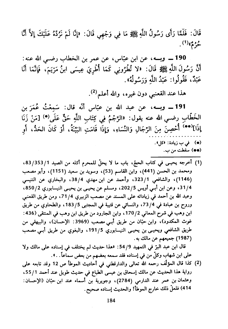 191 - وَبِهِ: عَنْ عَبْدِ اللَّهِ بْنِ عَبَّاسٍ، أَنَّهُ قَالَ: سَمِعْتُ عُمَرَ بْنَ الْخَطَّابِ رَضِيَ اللَّهُ عَنْهُ، يَقُولُ: «الرَّجْمُ فِي كِتَابِ اللَّهِ حَقٌّ عَلَى مَنْ زَنَا إِذَا أُحْصِنَ مِنَ الرَّجَالِ وَالنِّسَاءِ، وَإِذَا قَامَتِ الْبَيِّنَةِ، أَوْ كَانَ الْحَدُّ، أَوِ