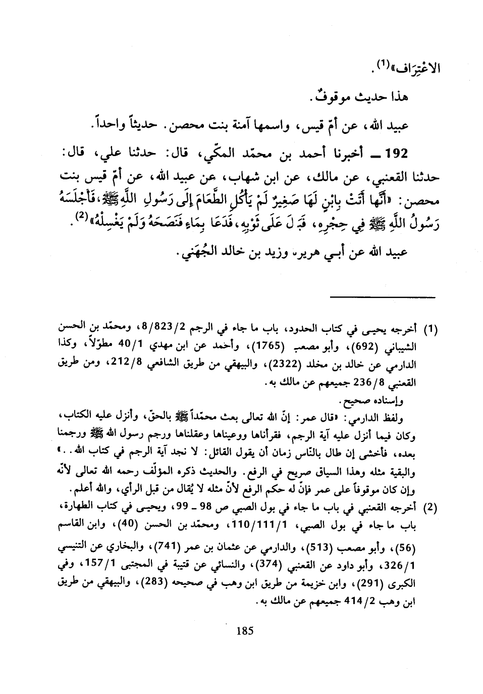 192 - أَخْبَرَنَا أَحْمَدُ بْنُ مُحَمَّدٍ الْمَكِّيُّ، قَالَ: حَدَّثَنَا عَلِيٌّ، قَالَ: حَدَّثَنَا الْقَعْنَبِيُّ، عَنْ مَالِكٍ، عَنِ ابْنِ شِهَابٍ، عَنْ عُبَيْدِ اللَّهِ، عَنْ أُمِّ قَيْسٍ بِنْتِ مِحْصَنٍ «أَنَّهَا أَتَتْ بِابْنٍ لَهَا صَغِيرٍ لَمْ يَأْكُلِ الطَّعَامَ إِلَى رَسُولِ اللَّهِ صَلَّى اللَّهُ عَلَيْهِ وَسَلَّمَ، فَأَجْلَسَهُ رَسُولُ اللَّهِ صَلَّى اللَّهُ عَلَيْهِ وَسَلَّمَ فِي حِجْرِهِ، فَبَالَ عَلَى ثَوْبِهِ، فَدَعَا بِمَاءٍ فَنَضَحَهُ وَلَمْ يَغْسِلْهُ».