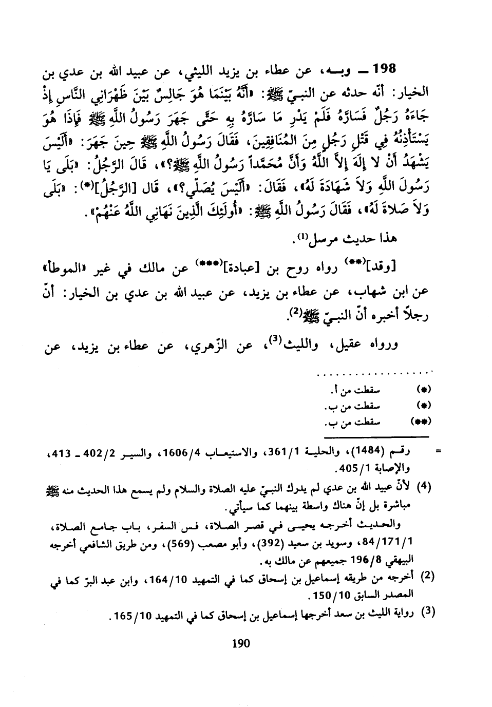 198 - وَبِهِ: عَنْ عَطَاءِ بْنِ يَزِيدَ اللَّيْثِيِّ، عَنْ عُبَيْدِ اللَّهِ بْنِ عَدِيِّ بْنِ الْخِيَارِ، أَنَّهُ حَدَّثَهُ عَنِ النَّبِيِّ صَلَّى اللَّهُ عَلَيْهِ وَسَلَّمَ: " أَنَّهُ بَيْنَمَا هُوَ جَالِسٌ بَيْنَ ظَهْرَانَيِ النَّاسِ إِذْ جَاءَهُ رَجُلٌ فَسَارَّهُ فَلَمْ يَدْرِ مَا سَارَّهُ بِهِ، حَتَّى جَهَرَ رَسُولُ اللَّهِ صَلَّى اللَّهُ عَلَيْهِ وَسَلَّمَ فَإِذَا هُوَ يَسْتَأْذِنُهُ فِي قَتْلِ رَجُلٍ مِنَ الْمُنَافِقِينَ، فَقَالَ رَسُولُ اللَّهِ صَلَّى اللَّهُ عَلَيْهِ وَسَلَّمَ حِينَ جَهَرَ: «أَلَيْسَ يَشْهَدُ أَنْ لا إِلَهَ إِلا اللَّهُ وَأَنَّ مُحَمَّدًا رَسُولُ اللَّهِ صَلَّى اللَّهُ عَلَيْهِ وَسَلَّمَ؟» , قَالَ الرَّجُلُ: بَلَى يَا رَسُولَ اللَّهِ وَلا شَهَادَةَ لَهُ، فَقَالَ: «أَلَيْسَ يُصَلِّي؟» , قَالَ الرَّجُلُ: بَلَى وَلا صَلاةَ لَهُ.