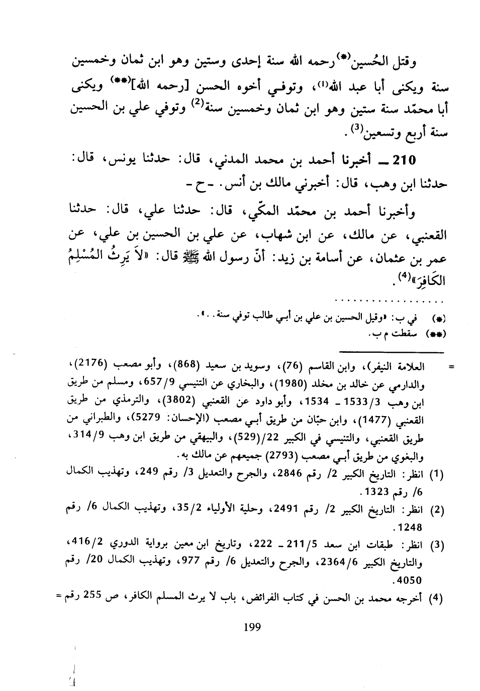 ح وَأَخْبَرَنَا أَحْمَدُ بْنُ مُحَمَّدٍ الْمَكِّيُّ، قَالَ: حَدَّثَنَا عَلِيٌّ، قَالَ: حَدَّثَنَا الْقَعْنَبِيُّ، عَنْ مَالِكٍ، عَنِ ابْنِ شِهَابٍ، عَنْ عَلِيِّ بْنِ الْحُسَيْنِ بْنِ عَلِيٍّ، عَنْ عُمَرَ بْنِ عُثْمَانَ، عَنْ أُسَامَةَ بْنِ زَيْدٍ، أَنَّ رَسُولَ اللَّهِ صَلَّى اللَّهُ عَلَيْهِ وَسَلَّمَ، قَالَ: «لا يَرِثُ الْمُسْلِمُ الْكَافِرَ».