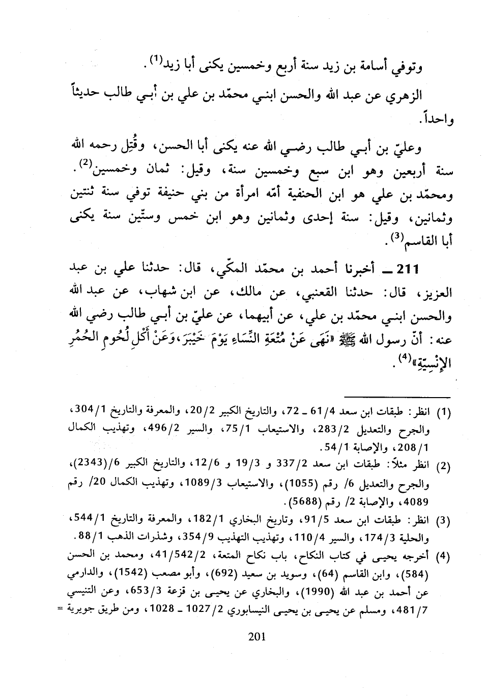 211 - أَخْبَرَنَا أَحْمَدُ بْنُ مُحَمَّدٍ الْمَكِّيُّ، قَالَ: حَدَّثَنَا عَلِيُّ بْنُ عَبْدِ الْعَزِيزِ، قَالَ: حَدَّثَنَا الْقَعْنَبِيُّ، عَنْ مَالِكٍ، عَنِ ابْنِ شِهَابٍ، عَنْ عَبْدِ اللَّهِ، وَالْحَسَنِ ابْنَيِ مُحَمَّدِ بْنِ عَلِيٍّ، عَنْ أَبِيهِمَا، عَنْ عَلِيِّ بْنِ أَبِي طَالِبٍ رَضِيَ اللَّهُ عَنْهُ، أَنَّ رَسُولَ اللَّهِ صَلَّى اللَّهُ عَلَيْهِ وَسَلَّمَ «نَهَى عَنْ مُتْعَةِ النِّسَاءِ يَوْمَ خَيْبَرَ، وَعَنْ أَكْلِ لُحُومِ الْحُمُرِ الإِنْسِيَّةِ».
