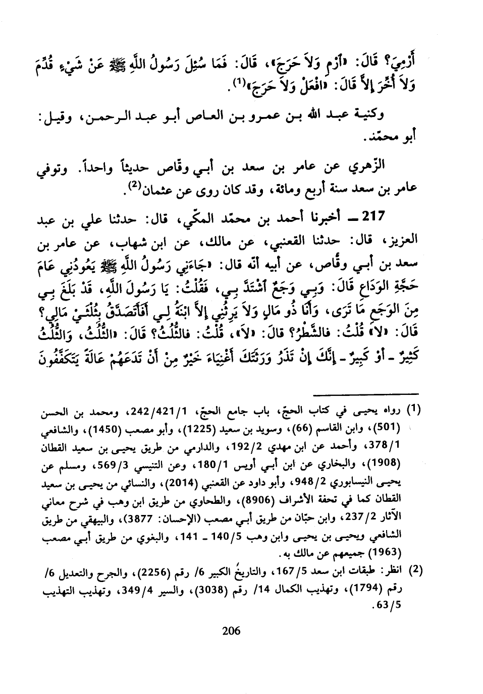 217 - أَخْبَرَنَا أَحْمَدُ بْنُ مُحَمَّدٍ الْمَكِّيُّ، قَالَ: حَدَّثَنَا عَلِيُّ بْنَ عَبْدِ الْعَزِيزِ، قَالَ: حَدَّثَنَا الْقَعْنَبِيُّ، عَنْ مَالِكٍ، عَنِ ابْنِ شِهَابٍ، عَنْ عَامِرِ بْنِ سَعْدِ بْنِ أَبِي وَقَّاصٍ، عَنْ أَبِيهِ، أَنَّهُ قَالَ: " جَاءَنِي رَسُولُ اللَّهِ صَلَّى اللَّهُ عَلَيْهِ وَسَلَّمَ يَعُودُنِي عَامَ حَجَّةِ الْوَدَاعِ، قَالَ: وَبِي وَجَعٌ اشْتَدَّ بِي.