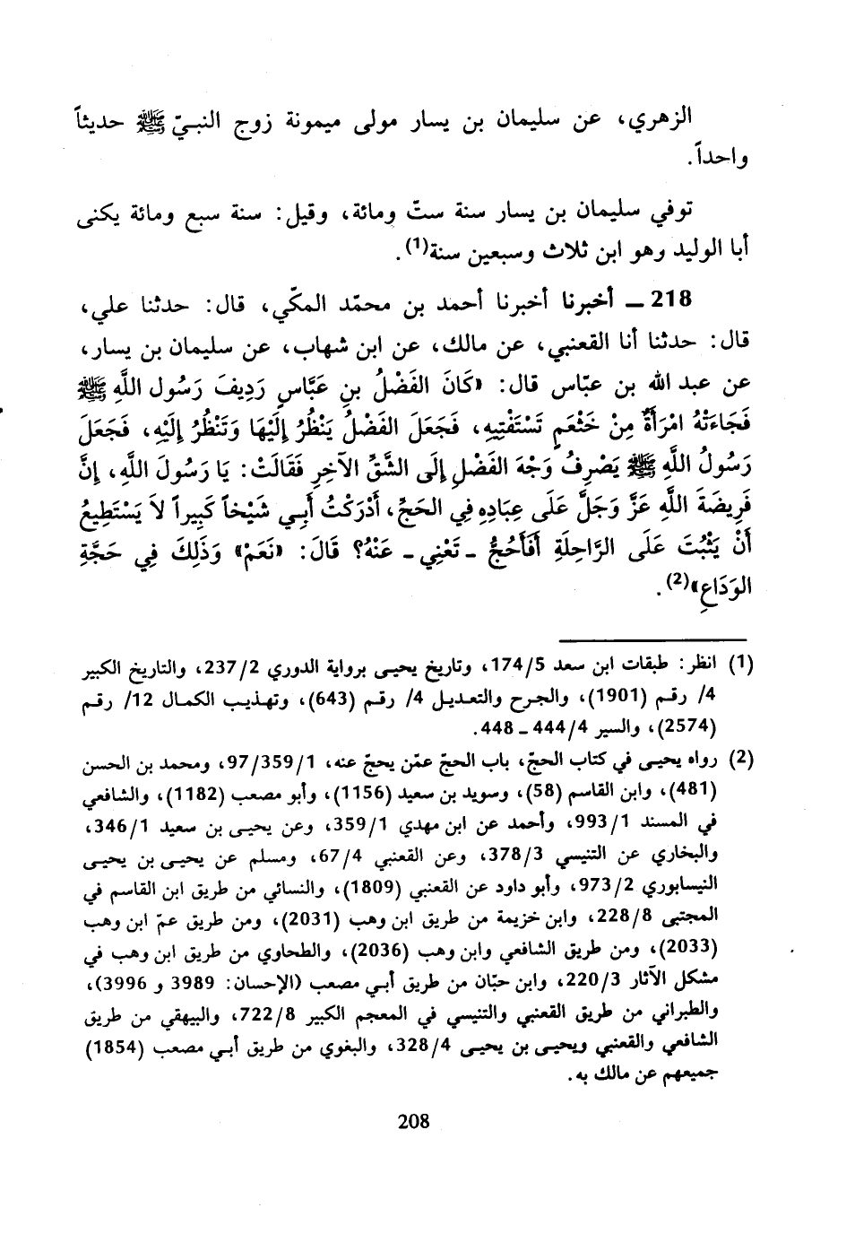 218 - أَخْبَرَنَا أَحْمَدُ بْنُ مُحَمَّدٍ الْمَكِّيُّ، قَالَ: حَدَّثَنَا عَلِيٌّ، قَالَ: حَدَّثَنَا أَنَا الْقَعْنَبِيُّ، عَنْ مَالِكٍ، عَنِ ابْنِ شِهَابٍ، عَنْ سُلَيْمَانَ بْنِ يَسَارٍ، عَنْ عَبْدِ اللَّهِ بْنِ عَبَّاسٍ، قَالَ: " كَانَ الْفَضْلُ بْنُ عَبَّاسٍ رَدِيفَ رَسُولِ اللَّهِ صَلَّى اللَّهُ عَلَيْهِ وَسَلَّمَ، فَجَاءَتْهُ امْرَأَةٌ مِنْ خَثْعَمَ تَسْتَفْتِيهِ، فَجَعَلَ الْفَضْلُ يَنْظُرُ إِلَيْهَا وَتَنْظُرُ إِلَيْهِ، فَجَعَلَ رَسُولُ اللَّهِ صَلَّى اللَّهُ عَلَيْهِ وَسَلَّمَ يَصْرِفُ وَجْهَ الْفَضْلِ إِلَى الشِّقِ الآخَرِ، فَقَالَتْ: يَا رَسُولَ اللَّهِ، إِنَّ فَرِيضَةَ اللَّهِ عَزَّ وَجَلَّ عَلَى عِبَادِهِ فِي الْحَجِّ، أَدْرَكَتْ أَبِي شَيْخًا كَبِيرًا لا يَسْتَطِيعُ أَنْ يَثْبُتَ عَلَى الرَّاحِلَةِ أَفَأَحُجُّ، تَعْنِي عَنْهُ؟ قَالَ: نَعَمْ.
