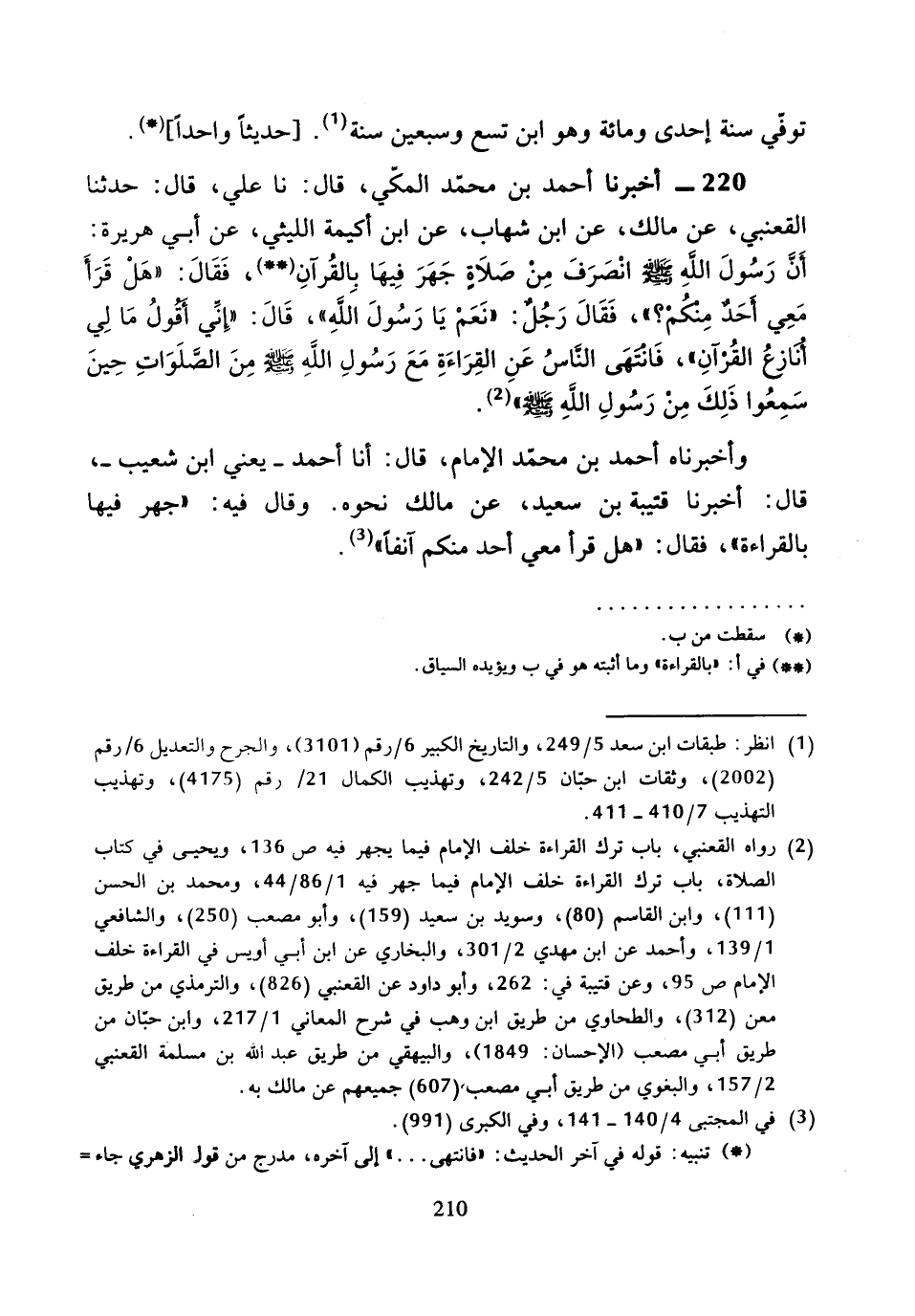 220 - أَخْبَرَنَا أَحْمَدُ بْنُ مُحَمَّدٍ الْمَكِّيُّ، قَالَ: نا عَلِيٌّ، قَالَ: حَدَّثَنَا الْقَعْنَبِيُّ، عَنْ مَالِكٍ، عَنِ ابْنِ شِهَابٍ، عَنِ ابْنِ أُكَيْمَةَ اللَّيْثِيِّ، عَنْ أَبِي هُرَيْرَةَ، أَنَّ رَسُولَ اللَّهِ صَلَّى اللَّهُ عَلَيْهِ وَسَلَّمَ " انْصَرَفَ مِنْ صَلاةٍ جَهَرَ فِيهِا بِالْقُرْآنِ، فَقَالَ: هَلْ قَرَأَ مَعِي أَحَدٌ مِنْكُمْ؟ فَقَالَ رَجُلٌ: نَعَمْ يَا رَسُولَ اللَّهِ.