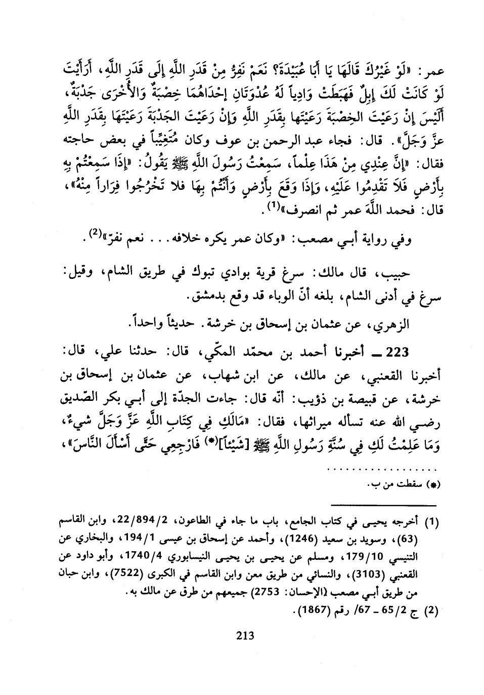 وَفِي رِوَايَةِ أَبِي مُصْعَبٍ: «وَكَانَ عُمَرُ يَكْرَهُ خِلافَهُ. . نَعَمْ نَفِرُّ»، حَبِيبٌ، قَالَ مَالِكٌ: سَرْغُ قَرْيَةٌ بِوَادِي تَبُوكَ فِي طَرِيقِ الشَّامِ، وَقِيلَ: سَرْغُ فِي أَدْنَى الشَّامِ، بَلَغَهُ أَنَّ الْوَبَاءَ قَدْ وَقَعَ بِدِمَشْقَ.