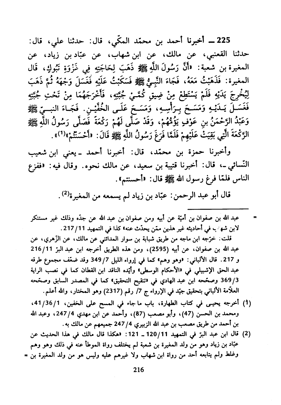 225 - أَخْبَرَنَا أَحْمَدُ بْنُ مُحَمَّدٍ الْمَكِّيُّ، قَالَ: حَدَّثَنَا عَلِيٌّ، قَالَ: حَدَّثَنَا الْقَعْنَبِيُّ، عَنْ مَالِكٍ، عَنِ ابْنِ شِهَابٍ، عَنْ عَبَّادِ بْنِ زِيَادٍ، عَنِ الْمُغِيرَةِ بْنِ شُعْبَةَ، أَنَّ رَسُولَ اللَّهِ صَلَّى اللَّهُ عَلَيْهِ وَسَلَّمَ ذَهَبَ لِحَاجَتِهِ فِي غَزْوَةِ تَبُوكَ، قَالَ الْمُغِيرَةُ: فَذَهَبْتُ مَعَهُ، فَجَاءَ النَّبِيُّ صَلَّى اللَّهُ عَلَيْهِ وَسَلَّمَ، فَسَكَبْتُ عَلَيْهِ، فَغَسَلَ وَجْهَهُ ثُمَّ ذَهَبَ لِيُخْرِجَ يَدَيْهِ فَلَمْ يَسْتَطِعْ مِنْ ضِيقِ كُمَّيْ جُبَّتِهِ، فَأَخْرَجَهُمَا مِنْ تَحْتِ جُبَّتِهِ فَغَسَلَ يَدَيْهِ وَمَسَحَ بِرَأْسِهِ، وَمَسَحَ عَلَى الْخُفَّيْنِ.