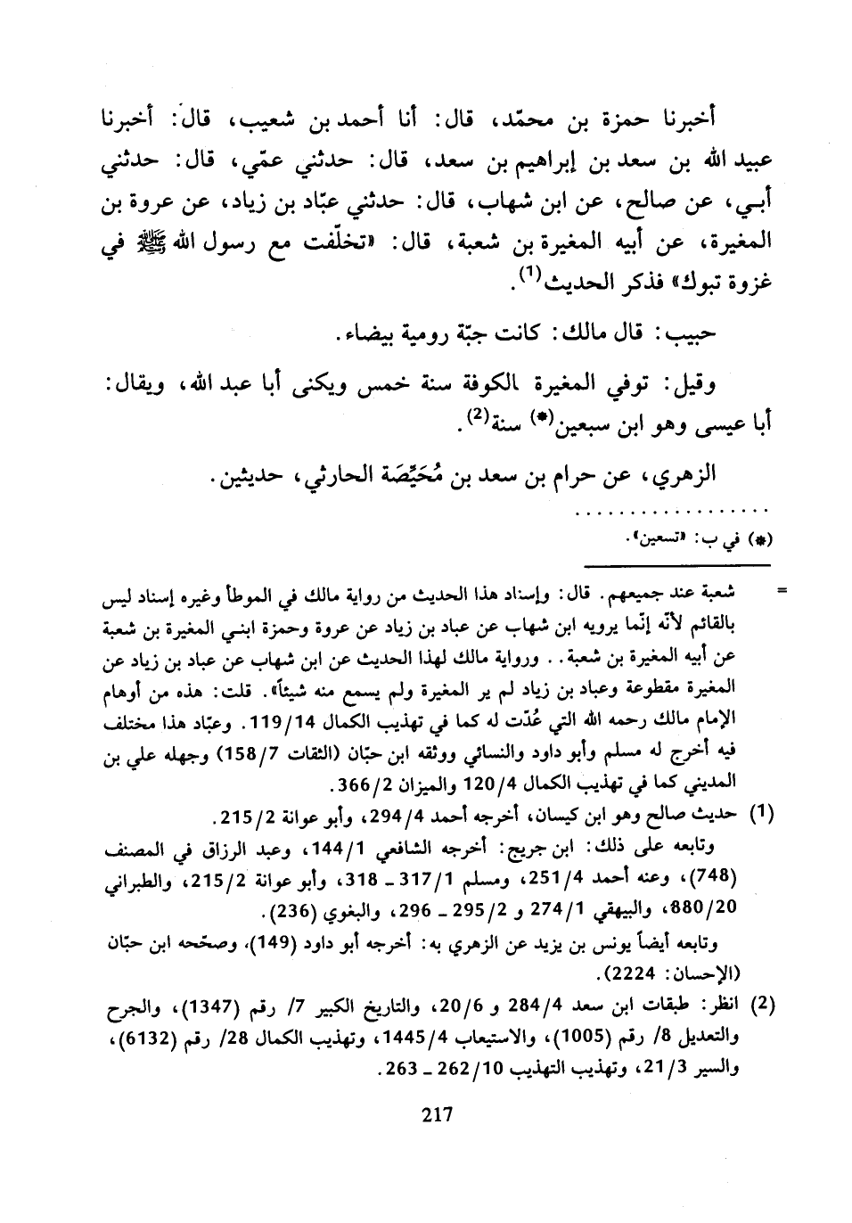 أَخْبَرَنَا حَمْزَةُ بْنُ مُحَمَّدٍ، قَالَ: أنا أَحْمَدُ بْنُ شُعَيْبٍ، قَالَ: أَخْبَرَنَا عُبَيْدُ اللَّهِ بْنُ سَعِيدِ بْنِ إِبْرَاهِيمَ بْنِ سَعْدٍ، قَالَ: حَدَّثَنِي عَمِّي، قَالَ: حَدَّثَنِي أَبِي، عَنْ صَالِحٍ، عَنِ ابْنِ شِهَابٍ، قَالَ: حَدَّثَنِي عَبَّادُ بْنُ زِيَادٍ، عَنْ عُرْوَةَ بْنِ الْمُغِيرَةِ، عَنْ أَبِيهِ الْمُغِيرَةِ بْنِ شُعْبَةَ، قَالَ: «تَخَلَّفْتُ مَعَ رَسُولِ اللَّهِ صَلَّى اللَّهُ عَلَيْهِ وَسَلَّمَ فِي غَزْوَةِ تَبُوكَ» فَذَكَرَ الْحَدِيثَ.