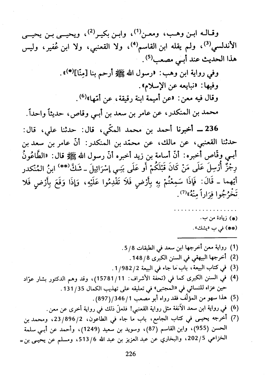 236 - أَخْبَرَنَا أَحْمَدُ بْنُ مُحَمَّدٍ الْمَكِّيُّ، قَالَ: حَدَّثَنَا عَلِيٌّ، قَالَ: حَدَّثَنَا الْقَعْنَبِيُّ، عَنْ مَالِكٍ، عَنْ مُحَمَّدِ بْنِ الْمُنْكَدِرِ أَنَّ عَامِرَ بْنَ سَعْدِ بْنِ أَبِي وَقَّاصٍ أَخْبَرَهُ أَنَّ أُسَامَةَ بْنَ زَيْدٍ أَخْبَرَهُ، أَنَّ رَسُولَ اللَّهِ صَلَّى اللَّهُ عَلَيْهِ وَسَلَّمَ، قَالَ: " الطَّاعُونُ رِجْزٌ أُرْسِلَ عَلَى مَنْ كَانَ قَبْلَكُمْ أَو عَلَى بَنِي إِسْرَائِيلَ شَكَّ ابْنُ الْمُنْكَدِرِ أَيُّهُمَا، قَالَ: فَإِذَا سَمِعْتُمْ بِهِ بِأَرْضٍ فَلا تَقْدَمُوا عَلَيْهِ، وَإِذَا وَقَعَ بِأَرْضٍ فَلا تَخْرُجُوا فِرَارًا مِنْهُ ".
