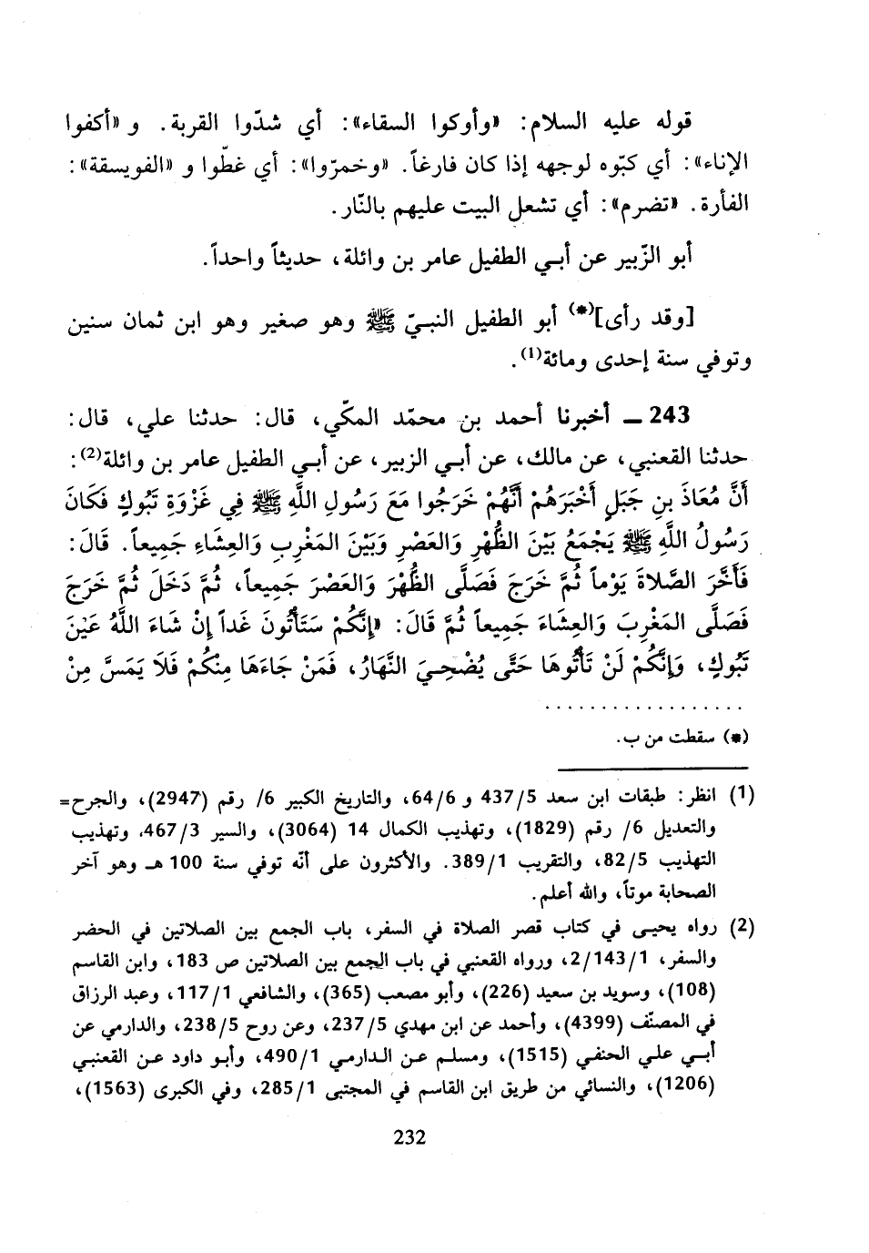 243 - أَخْبَرَنَا أَحْمَدُ بْنُ مُحَمَّدٍ الْمَكِّيُّ، قَالَ: حَدَّثَنَا عَلِيٌّ، قَالَ: حَدَّثَنَا الْقَعْنَبِيُّ، عَنْ مَالِكٍ، عَنْ أَبِي الزُّبَيْرِ، عَنْ أَبِي الطُّفَيْلِ عَامِرِ بْنِ وَائِلَةَ، أَنَّ مُعَاذَ بْنَ جَبَلٍ أَخْبَرَهُمْ: أَنَّهُمْ خَرَجُوا مَعَ رَسُولِ اللَّهِ صَلَّى اللَّهُ عَلَيْهِ وَسَلَّمَ فِي غَزْوةِ تَبُوكَ، فَكَانَ رَسُولُ اللَّهِ صَلَّى اللَّهُ عَلَيْهِ وَسَلَّمَ يَجْمَعُ بَيْنَ الظُّهْرِ وَالْعَصْرِ وَبَيْنَ الْمَغْرِبِ وَالْعِشَاءِ جَمِيعًا.