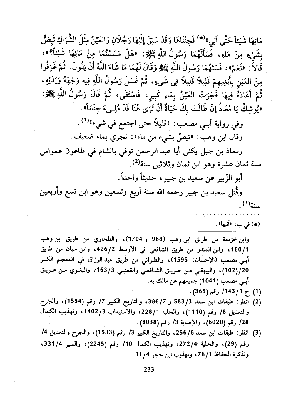مَائِهَا شَيْئًا حَتَّى آتِيَ، فَجِئْنَاهَا وَقَدْ سَبَقَ إِلَيْهَا رَجُلانِ وَالْعَيْنُ مِثْلُ الشِّرَاكِ تَبِضُّ بَشَيْءٍ مِنْ مَاءٍ، فَسَأَلَهُمَا رَسُولُ اللَّهِ صَلَّى اللَّهُ عَلَيْهِ وَسَلَّمَ: «هَلْ مَسَسْتُمَا مِنْ مَائِهَا شَيْئًا؟» قَالَ: نَعَمْ.
