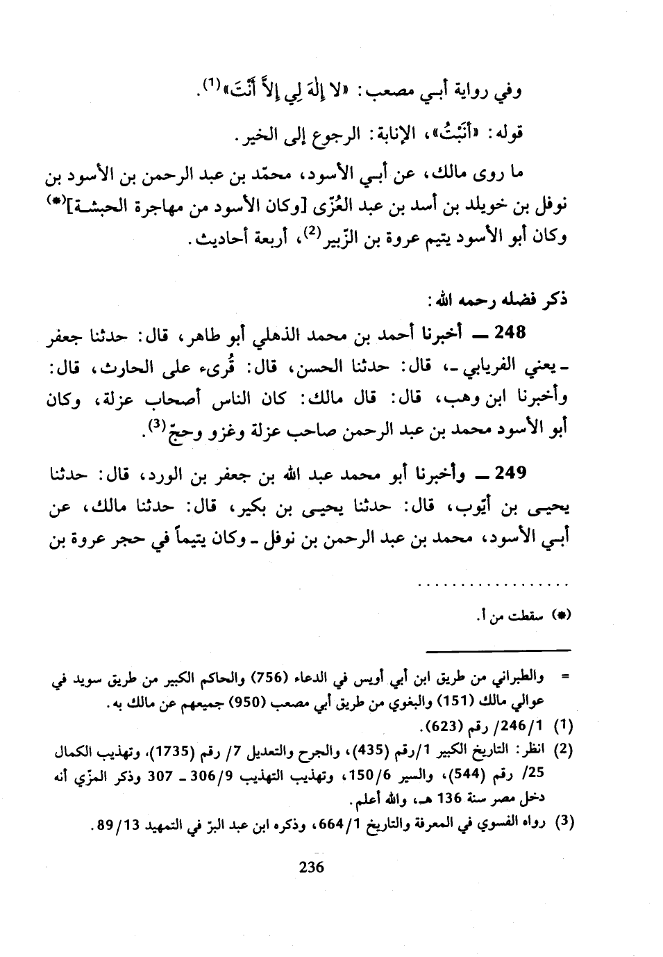 248 - أَخْبَرَنَا أَحْمَدُ بْنُ مُحَمَّدٍ الذُّهْلِيُّ أَبُو طَاهِرٍ، قَالَ: حَدَّثَنَا جَعْفَرٌ، يَعْنِي: الْفِرْيَابِيَّ، قَالَ: حَدَّثَنَا الْحَسَنُ، قَالَ: قُرِئَ عَلَى الْحَارِثِ، قَالَ: وَأَخْبَرَنَا ابْنُ وَهْبٍ، قَالَ: قَالَ مَالِكٌ «كَانَ النَّاسُ أَصْحَابَ عُزْلَةٍ، وَكَانَ أَبُو الأَسْوَدِ مُحَمَّدُ بْنُ عَبْدِ الرَّحْمَنِ صَاحِبَ عُزْلَةٍ وَغَزْوٍ وَحَجٍّ»