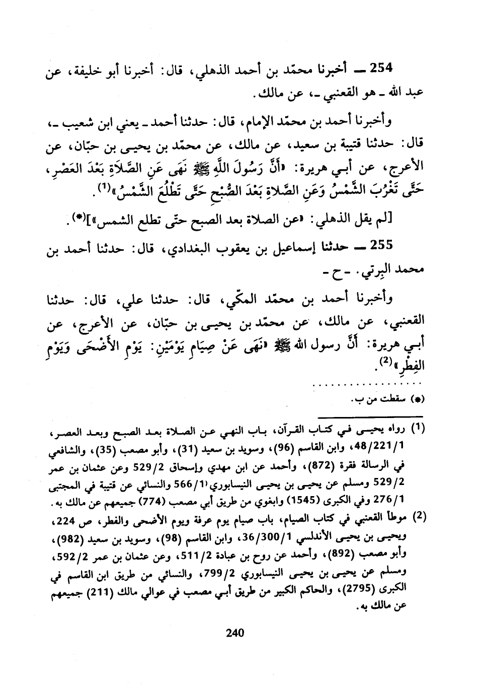 254 - أَخْبَرَنَا مُحَمَّدُ بْنُ أَحْمَدَ الذُّهْلِيُّ، قَالَ: أَحْمَدُ أَبُو خَلِيفَةَ، عَنْ عَبْدِ اللَّهِ هُوَ الْقَعْنَبِيُّ، عَنْ مَالِكٍ، وَأَخْبَرَنَا أَحْمَدُ بْنُ مُحَمَّدٍ الإِمَامُ، قَالَ: حَدَّثَنَا أَحْمَدُ، يَعْنِي: ابْنَ شُعَيْبٍ، قَالَ: حَدَّثَنَا قُتَيْبَةُ بْنُ سَعِيدٍ، عَنْ مَالِكٍ، عَنْ مُحَمَّدِ بْنِ يَحْيَى بْنِ حِبَّانَ، عَنِ الأَعْرَجِ، عَنْ أَبِي هُرَيْرَةَ، «أَنَّ رَسُولَ اللَّهِ صَلَّى اللَّهُ عَلَيْهِ وَسَلَّمَ» نَهَى عَنِ الصَّلاةِ بَعْدَ الْعَصْرِ، حَتَّى تَغْرُبَ الشَّمْسُ، وَعَنِ الصَّلاةِ بَعْدَ الصُّبْحِ حَتَّى تَطْلُعَ الشَّمْسُ ".