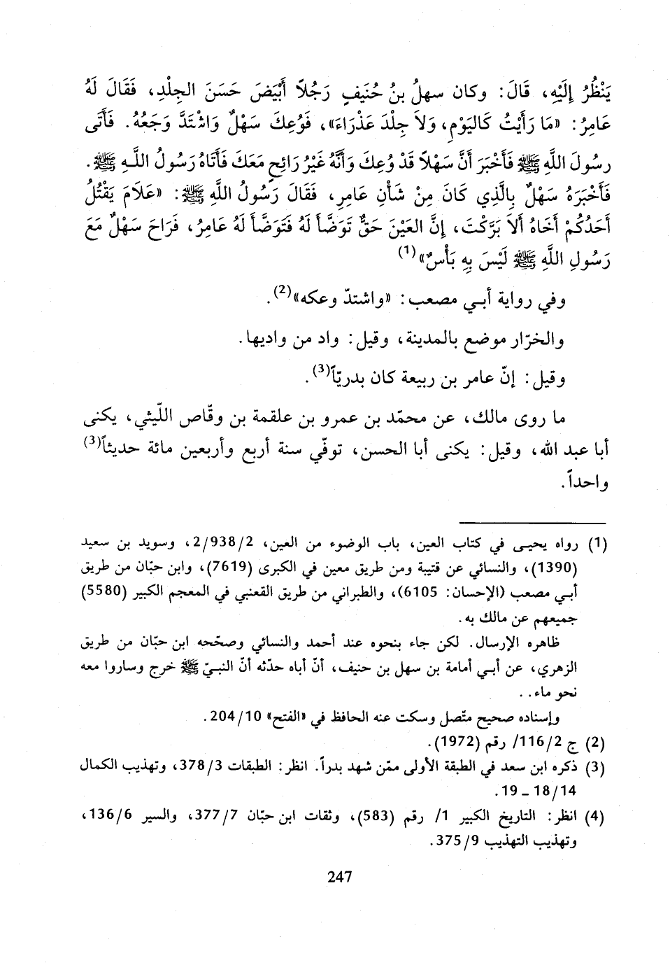 فَأَخْبَرَهُ سَهْلٌ بِالَّذِي كَانَ مِنْ شَأْنِ عَامِرٍ، فَقَالَ رَسُولُ اللَّهِ صَلَّى اللَّهُ عَلَيْهِ وَسَلَّمَ: عَلامَ يَقْتُلُ أَحَدُكُمْ أَخَاهُ أَلا بَرَّكْتَ، إِنَّ الْعَيْنَ حَقٌّ تَوَضَّأَ لَهُ، فَتَوَضَّأَ لَهُ عَامِرٌ، فَرَاحَ سَهْلٌ مَعَ رَسُولِ اللَّهِ صَلَّى اللَّهُ عَلَيْهِ وَسَلَّمَ لَيْسَ بِهِ بَأْسٌ ".