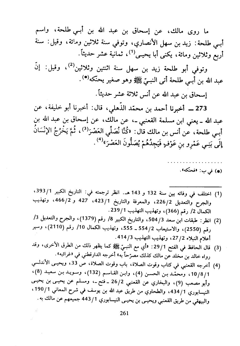 273 - أَخْبَرَنَا مُحَمَدُ بْنُ أَحْمَدَ الذُّهْلِيُّ، قَالَ: أَخْبَرَنَا أَبُو خَلِيفَةَ، عَنْ عَبْدِ اللَّهِ، يَعْنِي ابْنَ مَسْلَمَةَ الْقَعْنَبِيَّ، عَنْ مَالِكٍ، عَنْ إِسْحَاقَ بْنِ عَبْدِ اللَّهِ بْنِ أَبِي طَلْحَةَ، عَنْ أَنَسِ بْنِ مَالِكٍ، قَالَ: «كُنَّا نُصَلِّي الْعَصْرَ ثُمَّ يَخْرُجُ الإِنْسَانُ إِلَى بَنِي عَمْرِو بْنِ عَوْفٍ فَيَجِدُهُمْ يُصَلُّونَ الْعَصْرَ».