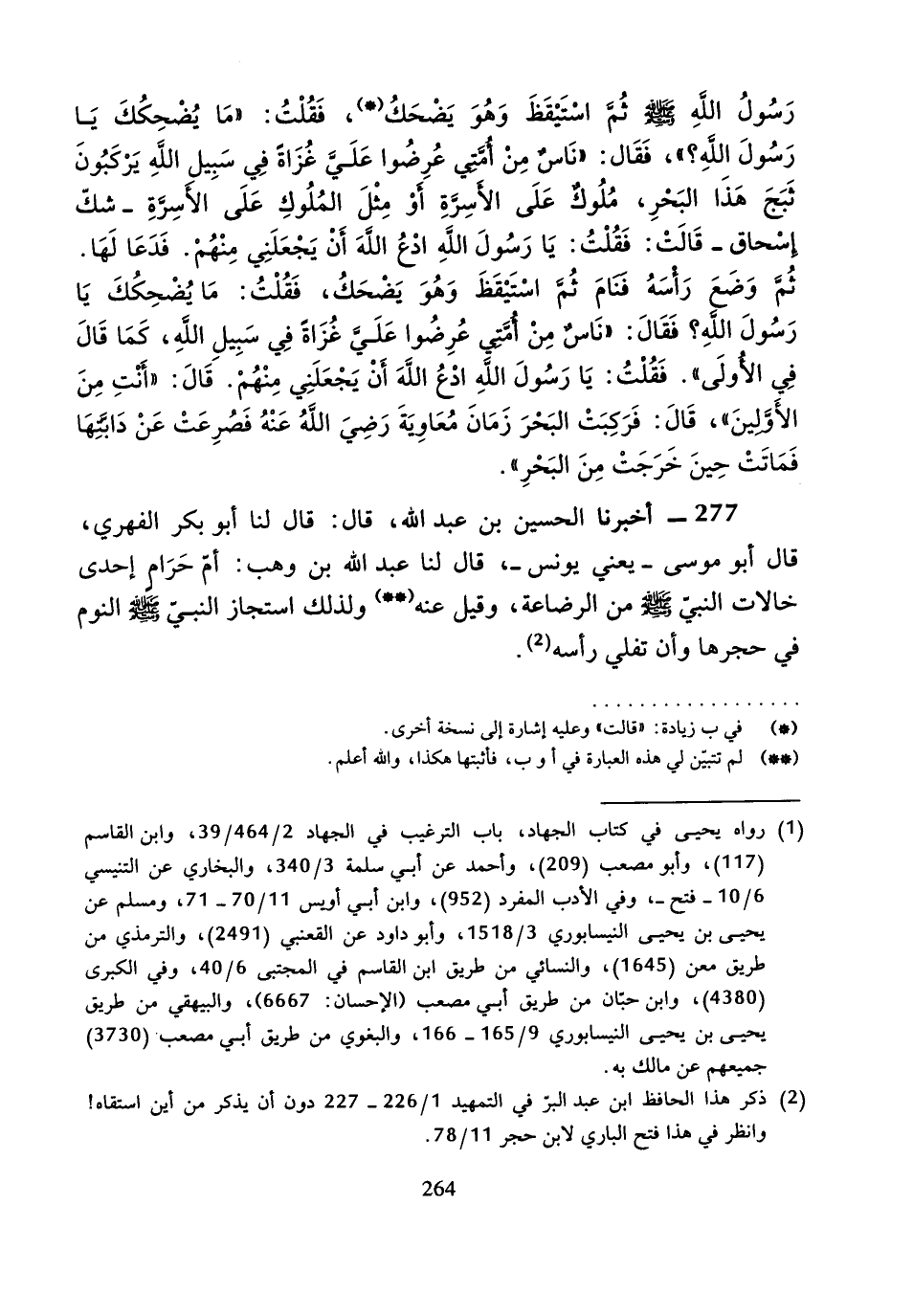 277 - أَخْبَرَنَا الْحُسَيْنُ بْنُ عَبْدِ اللَّهِ، قَالَ: قَالَ لَنَا أَبُو بَكْرٍ الْفِهْرِيُّ، قَالَ أَبُو مُوسَى يَعْنِي يُونُسَ، قَالَ لَنَا عَبْدُ اللَّهِ بْنُ وَهْبٍ «أُمُّ حَرَامٍ إِحْدَى خَالاتِ النَّبيِّ صَلَّى اللَّهُ عَلَيْهِ وَسَلَّمَ مِنَ الرَّضَاعَةِ، وَقِيلَ عَنْهُ، وَلِذَلِكَ اسْتَجَازَ النَّبيُّ صَلَّى اللَّهُ عَلَيْهِ وَسَلَّمَ النَّوْمُ فِي حِجْرِهَا وَأَنْ تَفْلِيَ رَأْسَهُ».