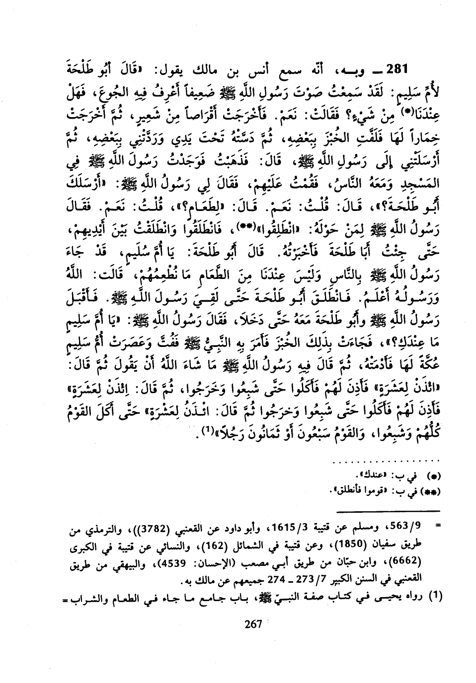 281 - وَبِهِ، أَنَّهُ سَمِعَ أَنَسَ بْنَ مَالِكٍ، يَقُولُ: قَالَ أَبُو طَلْحَةَ لأُمِّ سَلِيمٍ، لَقَدْ سَمِعْتُ صَوْتَ رَسُولِ اللَّهِ صَلَّى اللَّهُ عَلَيْهِ وَسَلَّمَ ضَعِيفًا أَعْرِفُ فِيهِ الْجُوعَ، فَهَلْ عِنْدَنَا مِنْ شَيْءٍ؟ فَقَالَتْ: نَعَمْ.