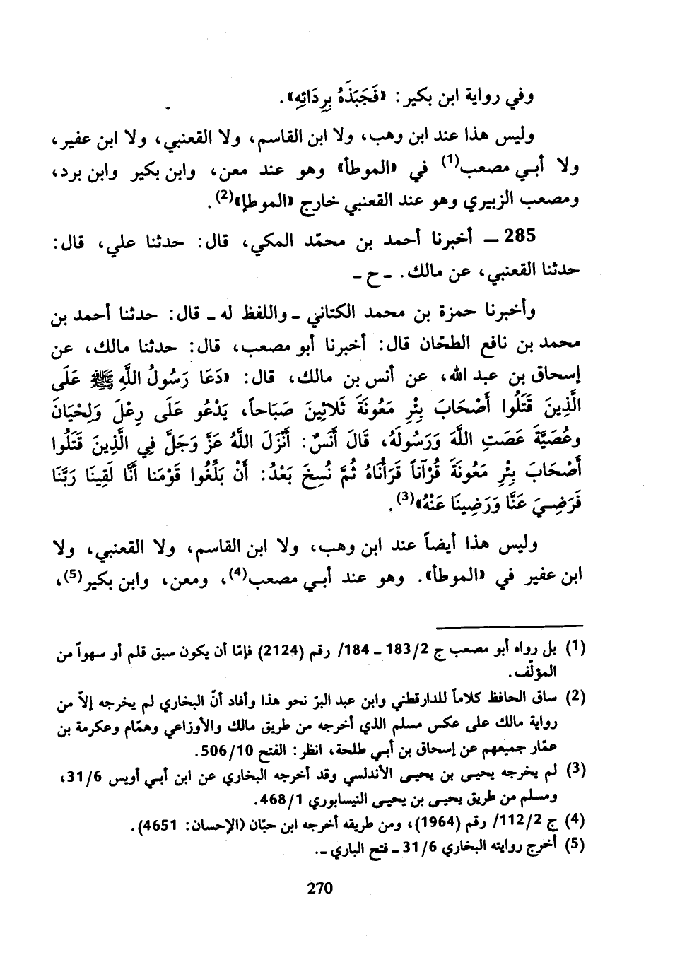وَلَيْسَ هَذَا عِنْدَ: ابْنِ وَهْبٍ، وَلا ابْنِ الْقَاسِمِ، وَلا الْقَعْنَبِيِّ، وَلا ابْنِ عُفَيْرٍ، وَلا أَبِي مُصْعَبٍ فِي الْمُوَطَّأِ وَهُوَ عِنْدَ مَعْنٍ، وَابْنِ بُكَيْرٍ، وَابْنِ بُرْدٍ، وَمُصْعَبٍ الزُّبَيْرِيِّ، وَهُوَ عِنْدَ الْقَعْنَبِيِّ خَارِجَ الْمُوَطَّأِ