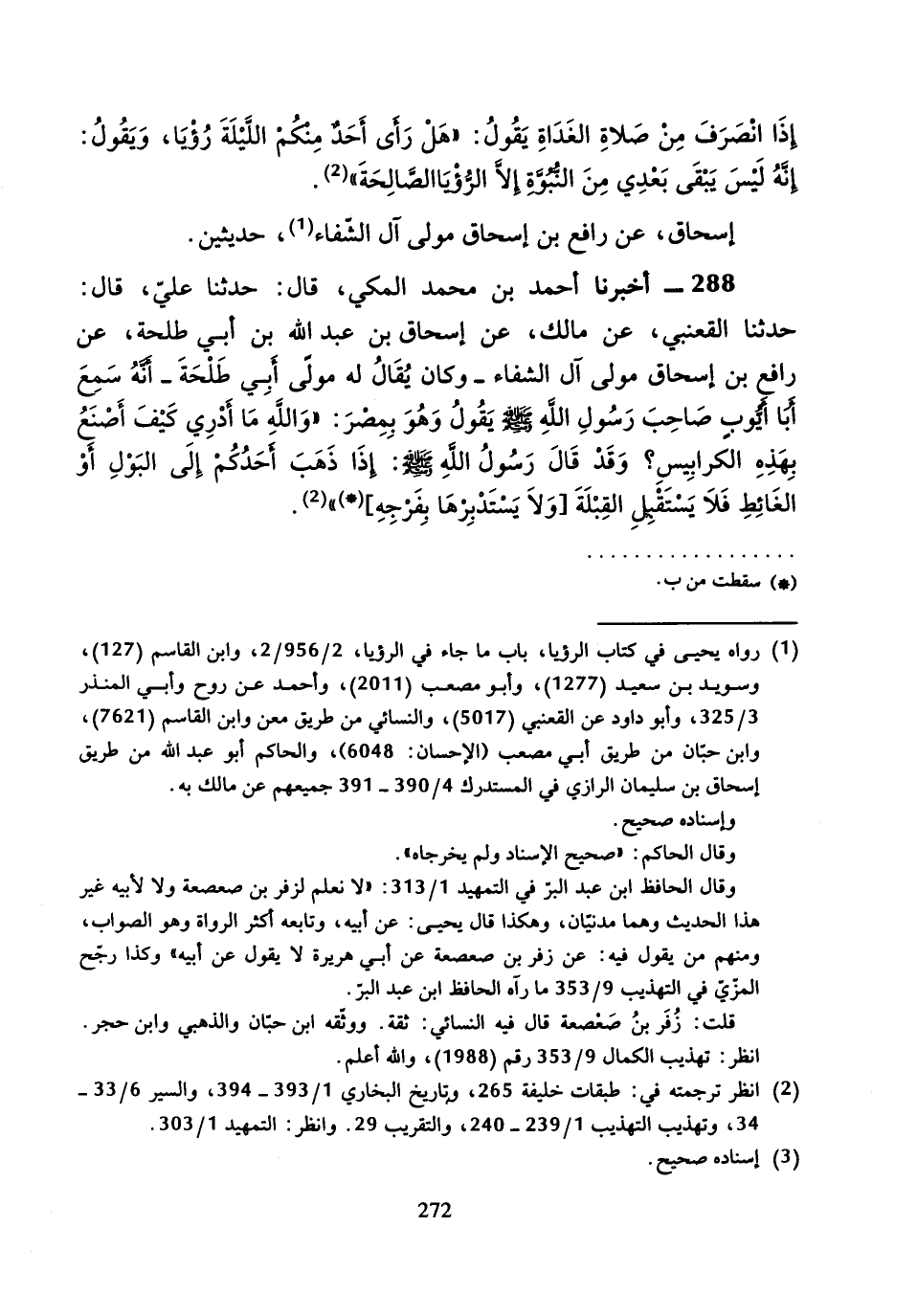 288 - أَخْبَرَنَا أَحْمَدُ بْنُ مُحَمَّدٍ الْمَكِّيُّ، قَالَ: حَدَّثَنَا عَلِيٌّ، قَالَ: حَدَّثَنَا الْقَعْنَبِيُّ، عَنْ مَالِكٍ، عَنْ إِسْحَاقَ بْنِ عَبْدِ اللَّهِ بْنِ أَبِي طَلْحَةَ، عَنْ رَافِعِ بْنِ إِسْحَاقَ مَوْلَى آلِ الشِّفَاءِ، وَكَانَ يُقَالُ لَهُ مَوْلَى أَبِي طَلْحَةَ، أَنَّهُ سَمِعَ أَبَا أَيُّوبَ صَاحِبَ رَسُولِ اللَّهِ صَلَّى اللَّهُ عَلَيْهِ وَسَلَّمَ، يَقُولُ وَهُوَ بِمِصْرَ: وَاللَّهِ مَا أَدْرِي كَيْفَ أَصْنَعُ بِهَذِهِ الْكَرَابِيسِ؟ وَقَدْ قَالَ رَسُولُ اللَّهِ صَلَّى اللَّهُ عَلَيْهِ وَسَلَّمَ: «إِذَا ذَهَبَ أَحَدُكُمْ إِلَى الْبَوْلِ أَوِ الْغَائِطِ فَلا يَسْتَقْبِلَ الْقِبْلَةَ وَلا يَسْتَدْبِرُهَا بِفَرْجِهِ».