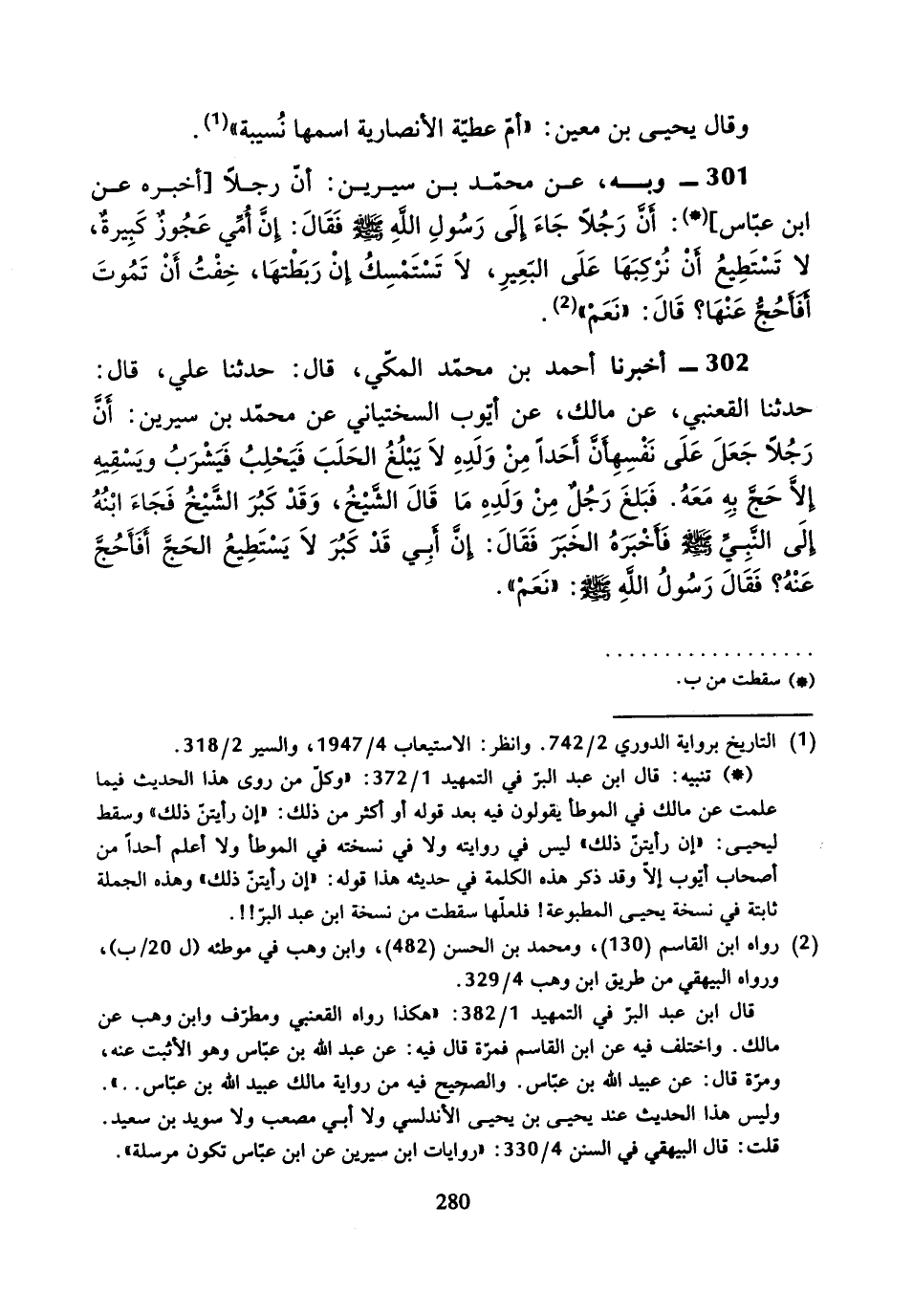 302 - أَخْبَرَنَا أَحْمَدُ بْنُ مُحَمَّدٍ الْمَكِّيُّ، قَالَ: حَدَّثَنَا عَلِيٌّ، قَالَ: حَدَّثَنَا الْقَعْنَبِيُّ، عَنْ مَالِكٍ، عَنْ أَيُّوبَ السَّخْتِيَانِيِّ، عَنْ مُحَمَّدِ بْنِ سِيرِينَ، أَنَّ رَجُلا جَعَلَ عَلَى نَفْسِهِ أَنَّ أَحَدًا مِنْ وَلَدِهِ لا يَبْلُغُ الْحَلَبَ فَيَحْلِبُ فَيَشْرَبُ ويَسْقِيهِ إِلا حَجَّ بِهِ مَعَهُ.