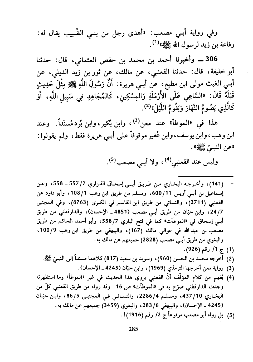 306 - وَأَخْبَرَنَا أَحْمَدُ بْنُ مُحَمَّدِ بْنِ حَفْصٍ الْعُثْمَانِيُّ، قَالَ: حَدَّثَنَا أَبُو خَلِيفَةَ، قَالَ: حَدَّثَنَا الْقَعْنَبِيُّ، عَنْ مَالِكٍ، عَنْ ثَوْرِ بْنِ زَيْدٍ الدِّيلِيِّ، عَنْ أَبِي الْغَيْثِ مَوْلَى ابْنِ مُطَيِعٍ عَنْ أَبِي هُرَيْرَةَ، أَنَّ رَسُولَ اللَّهِ صَلَّى اللَّهُ عَلَيْهِ وَسَلَّمَ مِثْلَ حَدِيثٍ قَبْلَهُ، قَالَ: «السَّاعِي عَلَى الأَرْمَلَةِ وَالْمِسْكِينِ.