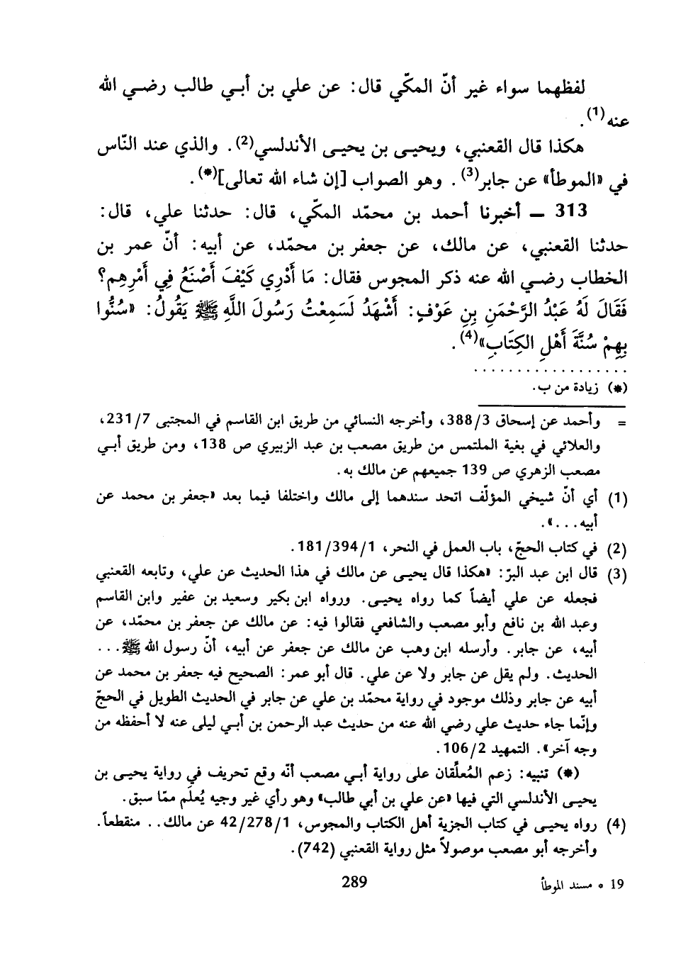 313 - أَخْبَرَنَا أَحْمَدُ بْنُ مُحَمَّدٍ الْمَكِّيُّ قَالَ: حَدَّثَنَا عَلِيٌّ، قَالَ: حَدَّثَنَا الْقَعْنَبِيُّ، عَنْ مَالِكٍ، عَنْ جَعْفَرِ بْنِ مُحَمَّدٍ، عَنْ أَبِيهِ، أَنَّ عُمَرَ بْنَ الْخَطَّابِ رَضِيَ اللَّهُ عَنْهُ ذَكَرَ الْمَجُوسَ، فَقَالَ: مَا أَدْرِي كَيْفَ أَصْنَعُ فِي أَمْرِهِمْ؟ فَقَالَ لَهُ عَبْدُ الرَّحْمَنِ بْنُ عَوْفٍ: أَشْهَدُ لَسَمِعْتُ رَسُولَ اللَّهِ صَلَّى اللَّهُ عَلَيْهِ وَسَلَّمَ، يَقُولُ: «سُنُّوا بِهِمْ سُنَّةَ أَهْلَ الْكِتَابِ».