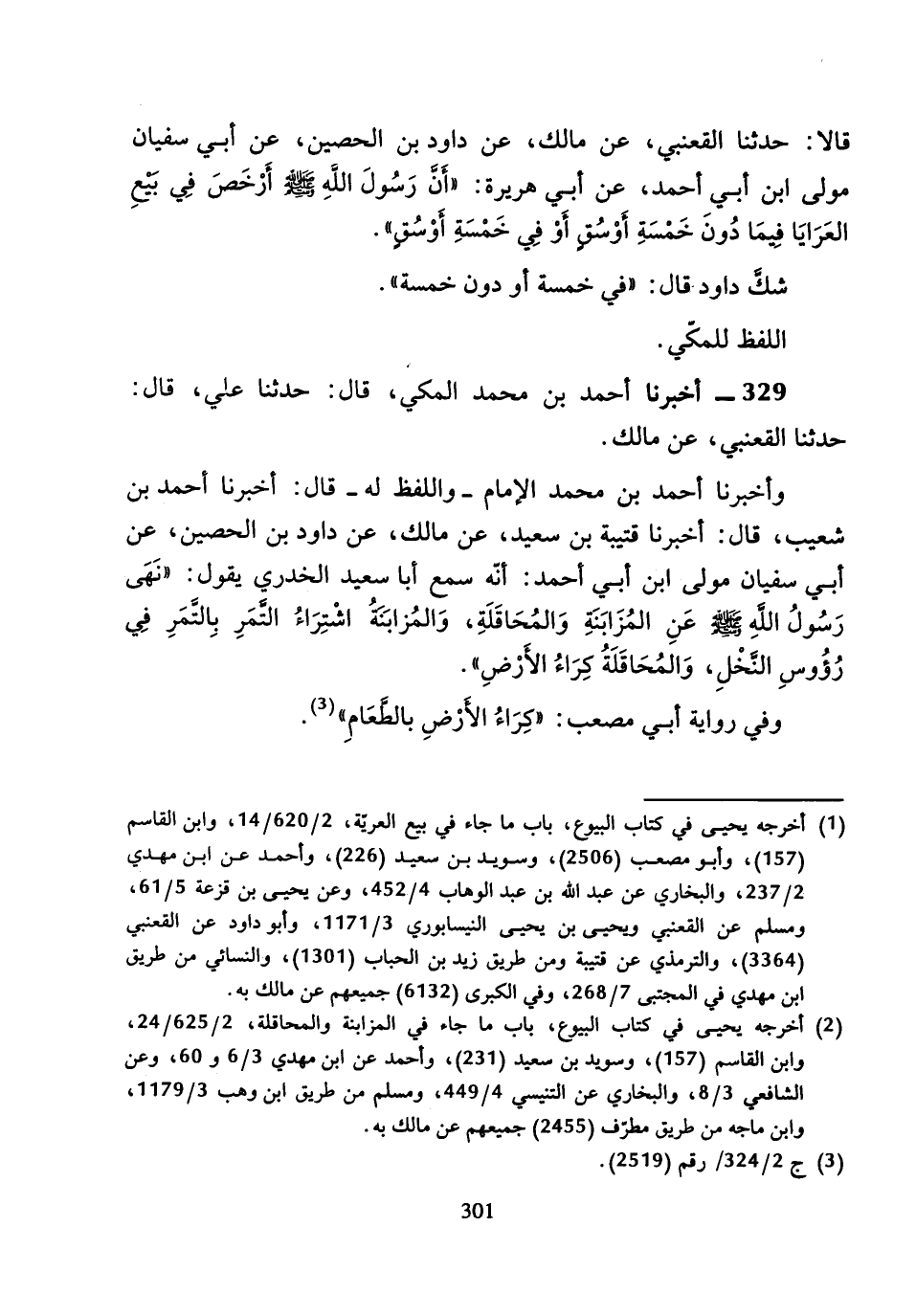 329 - أَخْبَرَنَا أَحْمَدُ بْنُ مُحَمَّدٍ الْمَكِّيُّ، قَالَ: حَدَّثَنَا عَلِيٌّ، قَالَ: حَدَّثَنَا الْقَعْنَبِيُّ، عَنْ مَالِكٍ، وَأَخْبَرَنَا وَاللَّفْظُ لَهُ، أَحْمَدُ بْنُ مُحَمَّدٍ الإِمَامُ 9، قَالَ: أَخْبَرَنَا أَحْمَدُ بْنُ شُعَيْبٍ، قَالَ: أَخْبَرَنَا قُتَيْبَةُ بْنُ سَعِيدٍ، عَنْ مَالِكٍ، عَنْ دَاوُدَ بْنِ الْحُصَيْنِ، عَنْ أَبِي سُفْيَانَ مَوْلَى ابْنِ أَبِي أَحْمَدَ: أَنَّهُ سَمِعَ أَبَا سَعِيدٍ الْخُدْرِيَّ، يَقُولُ: " نَهَى رَسُولُ اللَّهِ صَلَّى اللَّهُ عَلَيْهِ وَسَلَّمَ عَنِ الْمُزَابَنَةِ والْمُحَاقَلَةِ، وَالْمُزَابَنَةُ: اشْتِرَاءُ التَّمْرِ بِالتَّمْرِ فِي رُءُوسِ النَّخْلِ، وَالْمُحَاقَلَةُ: كِرَاءُ الأَرْضِ ".