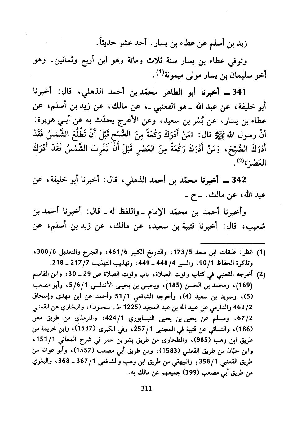 341 - أَخْبَرَنَا أَبُو الطَّاهِرِ مُحَمَّدُ بْنُ أَحْمَدَ الذُّهْلِيُّ، قَالَ: أَخْبَرَنَا أَبُو خَلِيفَةَ، عَنْ عَبْدِ اللَّهِ هُوَ الْقَعْنَبِيُّ، عَنْ مَالِكٍ، عَنْ زَيْدِ بْنِ أَسْلَمَ، عَنْ عَطَاءِ بْنِ يَسَارٍ، عَنْ بُسْرِ بْنِ سَعِيدٍ، وَعَنِ الأَعْرَجِ، يُحَدِّثُ بِهِ، عَنْ أَبِي هُرَيْرَةَ، أَنَّ رَسُولَ اللَّهِ صَلَّى اللَّهُ عَلَيْهِ وَسَلَّمَ، قَالَ: «مَنْ أَدْرَكَ رَكْعَةً مِنَ الصُّبْحِ قَبْلَ أَنْ تَطْلُعَ الشَّمْسُ فَقَدْ أَدْرَكَ الصُّبْحَ، وَمَنْ أَدْرَكَ رَكْعَةً مِنَ الْعَصْرِ قَبْلَ أَنْ تَغْرُبَ الشَّمْسُ فَقَدْ أَدْرَكَ الْعَصْرَ»
