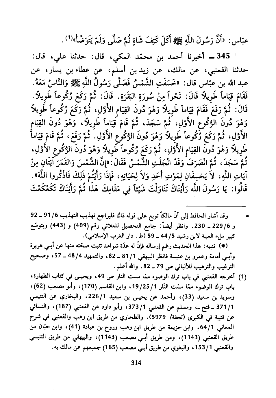 345 - أَخْبَرَنَا أَحْمَدُ بْنُ مُحَمَّدٍ الْمَكِّيُّ، قَالَ: حَدَّثَنَا عَلِيٌّ، قَالَ: حَدَّثَنَا الْقَعْنَبِيُّ، عَنْ مَالِكٍ، عَنْ زَيْدِ بْنِ أَسْلَمَ، عَنْ عَطَاءِ بْنِ يَسَارٍ، عَنْ عَبْدِ اللَّهِ بْنِ عَبَّاسٍ، قَالَ: خَسَفَتِ الشَّمْسُ فَصَلَّى رَسُولُ اللَّهِ صَلَّى اللَّهُ عَلَيْهِ وَسَلَّمَ وَالنَّاسُ مَعَهُ، فَقَامَ قِيَامًا طَوِيلا، قَالَ نَحْوًا مِنْ سُورَةِ الْبَقَرَةِ.