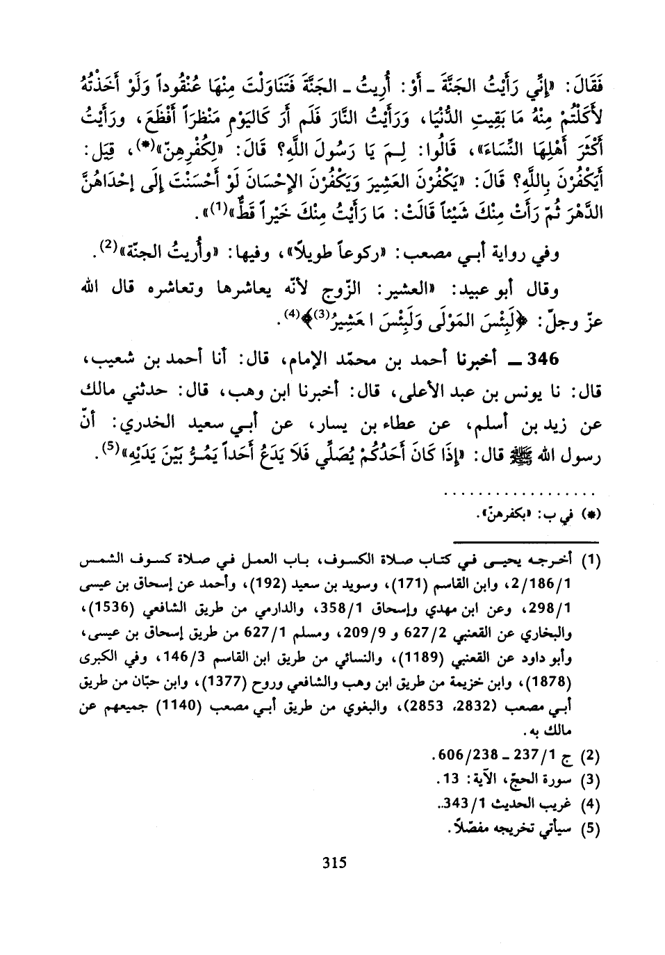 فَقَالَ: " إِنِّي رَأَيْتُ الْجَنَّةَ أَوْ: أُرِيتُ الْجَنَّةَ، فَتَنَاوَلْتُ مِنْهَا عُنْقُودًا وَلَوْ أَخَذْتُهُ لأَكَلْتُمْ مِنْهُ مَا بَقِيتِ الدُّنْيَا، وَرَأَيْتُ النَّارَ فَلَمْ أَرَ كَالْيَوْمِ مَنْظَرًا أَفْظَعَ، وَرَأَيْتُ أَكْثَرَ أَهْلِهَا النِّسَاءَ ".