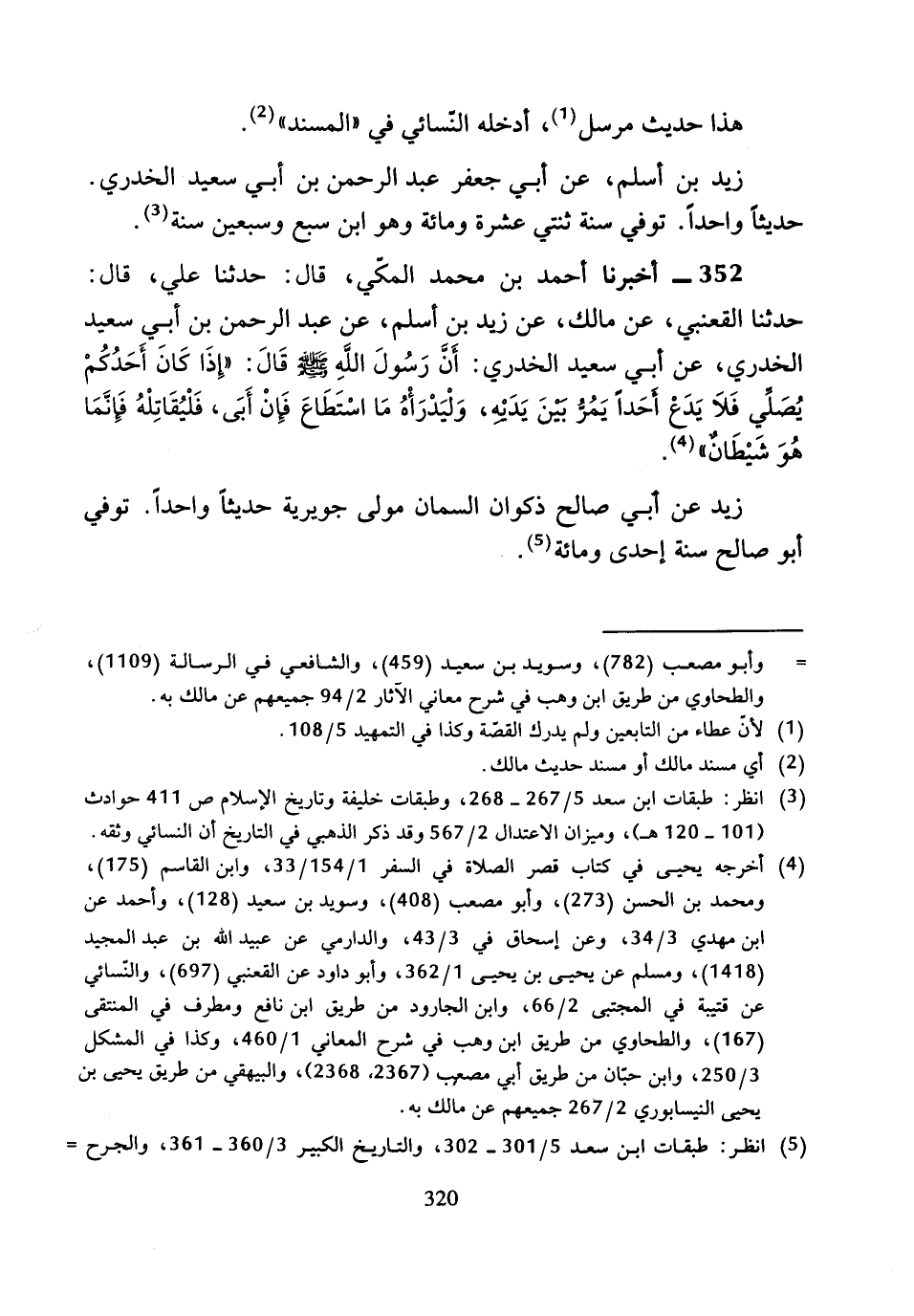 352 - أَخْبَرَنَا أَحْمَدُ بْنُ مُحَمَّدٍ الْمَكِّيُّ، قَالَ: حَدَّثَنَا عَلِيٌّ، قَالَ: حَدَّثَنَا الْقَعْنَبِيُّ، عَنْ مَالِكٍ، عَنْ زَيْدِ بْنِ أَسْلَمَ، عَنْ عَبْدِ الرَّحْمَنِ بْنِ أَبِي سَعِيدٍ الْخُدْرِيِّ، عَنْ أَبِي سَعِيدٍ الْخُدْرِيِّ، أَنَّ رَسُولَ اللَّهِ صَلَّى اللَّهُ عَلَيْهِ وَسَلَّمَ قَالَ: «إِذَا كَانَ أَحَدُكُمْ يُصَلِّي فَلا يَدَعُ أَحَدًا يَمُرُّ بَيْنَ يَدَيْهِ، وَلْيَدْرَأْهُ مَا اسْتَطَاعَ، فَإِنْ أَبَى فَلْيُقَاتِلْهُ فَإِنَّمَا هُوَ شَيِطَانٌ»