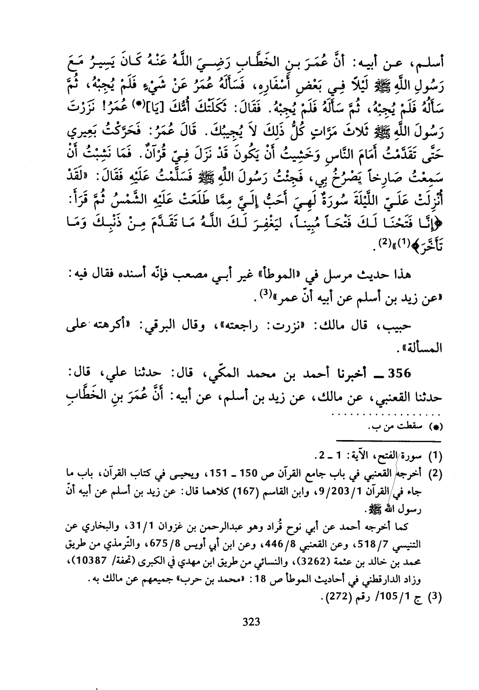 356 - أَخْبَرَنَا أَحْمَدُ بْنُ مُحَمَّدٍ الْمَكِّيُّ، قَالَ: حَدَّثَنَا عَلِيٌّ، قَالَ: حَدَّثَنَا الْقَعْنَبِيُّ، عَنْ مَالِكٍ، عَنْ زَيْدِ بْنِ أَسْلَمَ، عَنْ أَبِيهِ، أَنَّ عُمَرَ بْنَ الْخَطَّابِ
