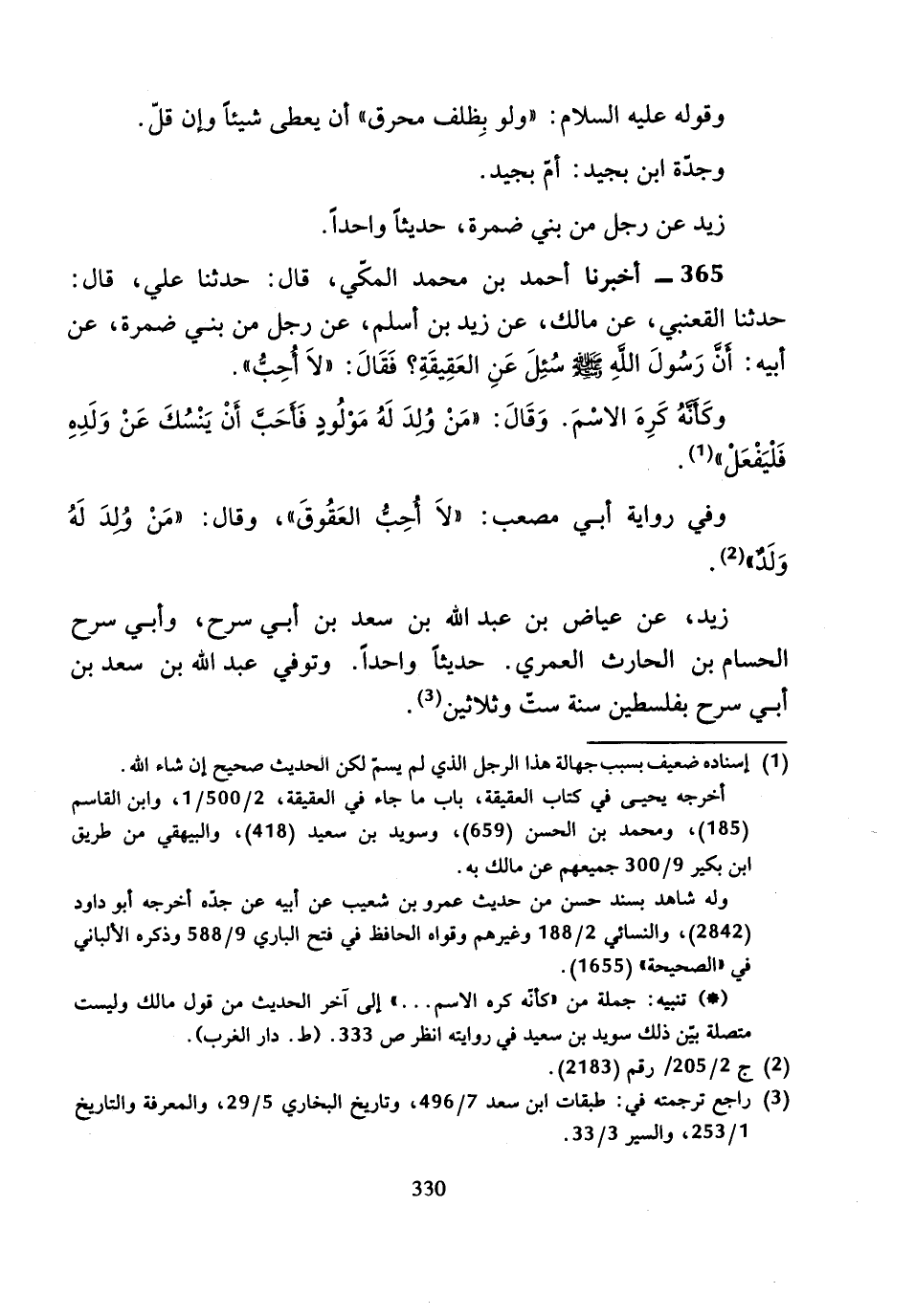 365 - أَخْبَرَنَا أَحْمَدُ بْنُ مُحَمَّدٍ الْمَكِّيُّ، قَالَ: حَدَّثَنَا عَلِيٌّ، قَالَ: حَدَّثَنَا الْقَعْنَبِيُّ، عَنْ مَالِكٍ، عَنْ زَيْدِ بْنِ أَسْلَمَ، عَنْ رَجُلٍ مِنْ بَنِي ضَمْرَةَ، عَنْ أَبِيهِ، " أَنَّ رَسُولَ اللَّهِ صَلَّى اللَّهُ عَلَيْهِ وَسَلَّمَ سُئِلَ عَنِ الْعَقِيقَةِ؟ فَقَالَ: لا أُحِبَّ ".