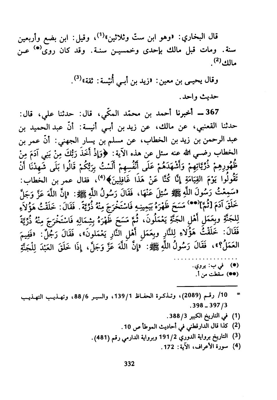 367 - أَخْبَرَنَا أَحْمَدُ بْنُ مُحَمَّدٍ الْمَكِّيُّ، قَالَ: حَدَّثَنَا عَلِيٌّ، قَالَ: حَدَّثَنَا الْقَعْنَبِيُّ، عَنْ مَالِكٍ، عَنْ زَيْدِ بْنِ أَبِي أُنَيْسَةَ، أَنَّ عَبْدَ الْحَمِيدِ بْنَ عَبْدِ الرَّحْمَنِ بْنِ زَيْدِ بْنِ الْخَطَّابِ، عَنْ مُسْلِمِ بْنِ يَسَارٍ الْجُهَنِيِّ أَنَّ عُمَرَ بْنَ الْخَطَّابِ رَضِيَ اللَّهُ عَنْهُ سُئِلَ عَنْ هَذِهِ الآيَةِ: {وَإِذْ أَخَذَ رَبُّكَ مِنْ بَنِي آدَمَ مِنْ ظُهُورِهِمْ ذُرِّيَّتَهُمْ وَأَشْهَدَهُمْ عَلَى أَنْفُسِهِمْ أَلَسْتُ بِرَبِّكُمْ قَالُوا بَلَى شَهِدْنَا أَنْ تَقُولُوا يَوْمَ الْقِيَامَةِ إِنَّا كُنَّا عَنْ هَذَا غَافِلِينَ} [الأعراف: 172]، فَقَالَ عُمَرُ بْنُ الْخَطَّابِ: سَمِعْتُ رَسُولَ اللَّهِ صَلَّى اللَّهُ عَلَيْهِ وَسَلَّمَ سُئِلَ عَنْهَا، فَقَالَ رَسُولُ اللَّهِ صَلَّى اللَّهُ عَلَيْهِ وَسَلَّمَ: إِنَّ اللَّهَ عَزَّ وَجَلَّ خَلَقَ آدَمَ ثُمَّ مَسَحَ ظَهْرَهُ بِيَمِينِهِ فَاسْتَخَرَجَ مِنْهُ ذُرِّيَّةً.
