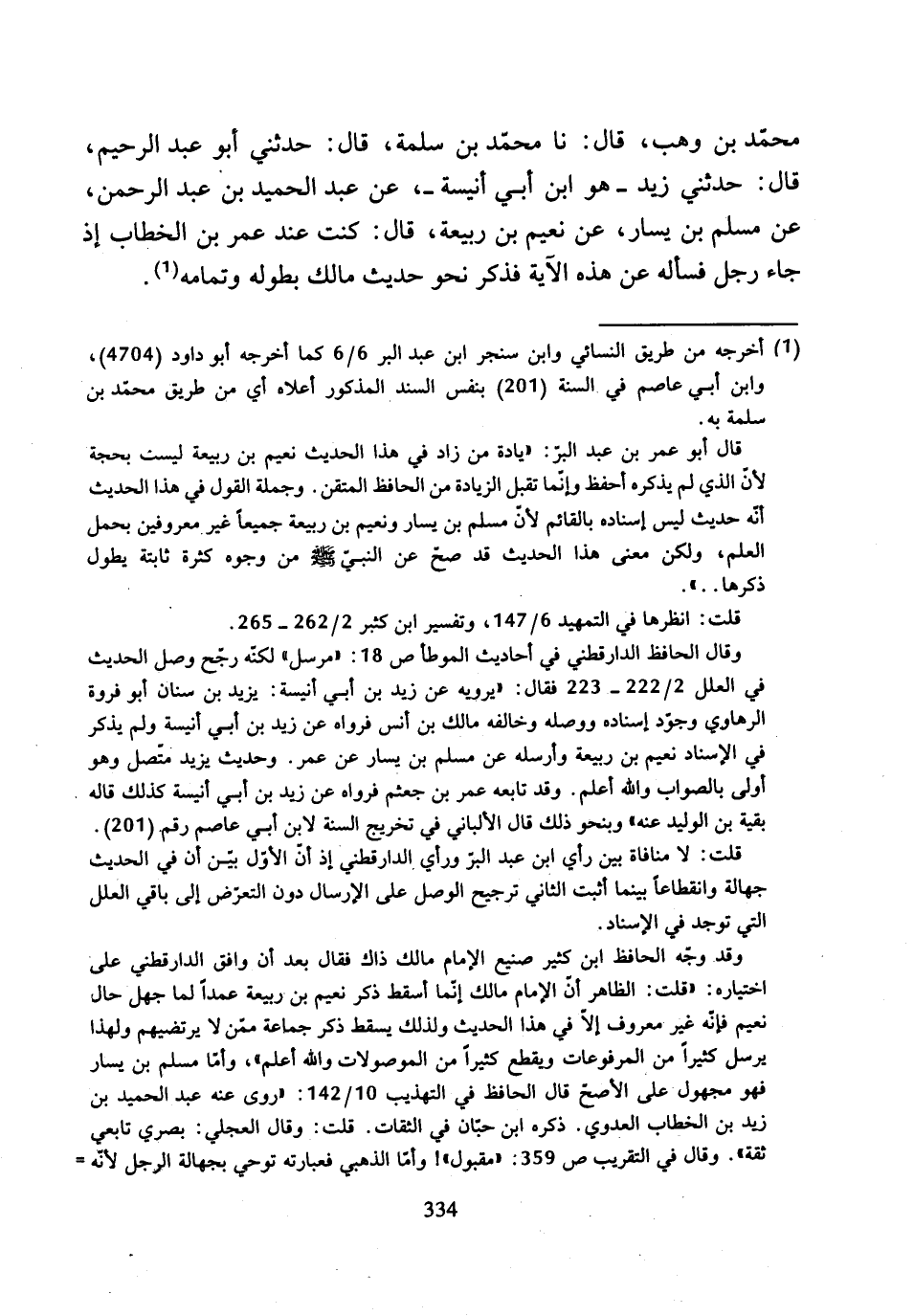 مُحَمَّدُ بْنُ وَهْبٍ، قَالَ: نَا مُحَمَّدُ بْنُ سَلَمَةَ، قَالَ: حَدَّثَنِي أَبُو عَبْدِ الرَّحِيمِ: قَالَ: حَدَّثَنِي زَيْدٌ هُوَ ابْنُ أَبِي أُنَيْسَةَ، عَنْ عَبْدِ الْحَمِيدِ بْنِ عَبْدِ الرَّحْمَنِ، عَنْ مُسْلِمِ بْنِ يَسَارٍ، عَنْ نُعَيْمِ بْنِ رَبِيعَةَ، قَالَ: كُنْتُ عِنْدَ عُمَرَ بْنِ الْخَطَّابِ إِذَ جَاءَ رَجُلٌ فَسَأَلَهُ عَنْ هَذِهِ الآيَةِ، فَذَكَرَ نَحْوَ حَدِيثِ مَالِكٍ بِطُولِهِ وَتَمَامِهِ "