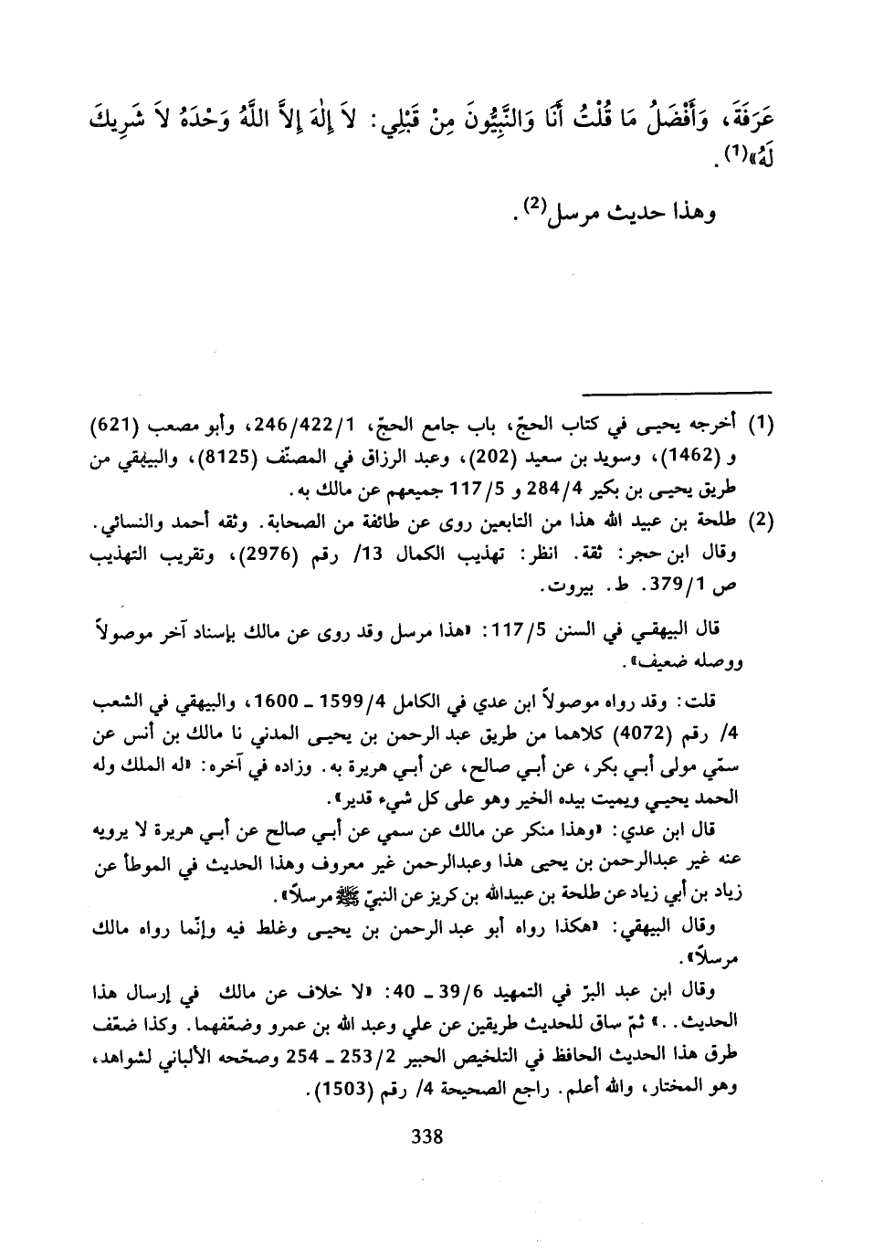 عَرَفَةَ، وَأَفْضَلُ مَا قُلْتُ أَنَا وَالنَّبِيُّونَ مِنْ قَبْلِي: لا إِلَهَ إِلا اللَّهُ وَحْدَهُ لا شَرِيكَ لَهُ ".