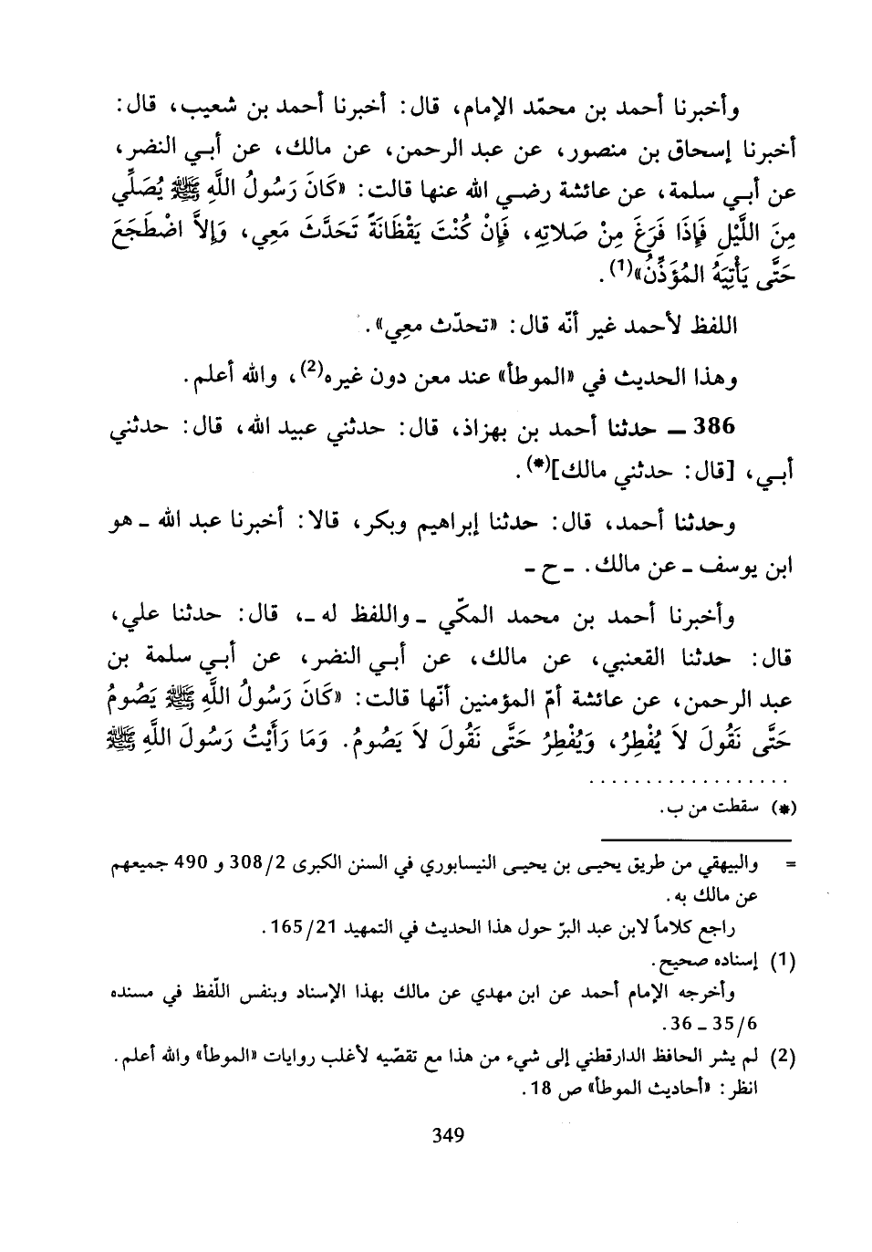 ح وَأَخْبَرَنَا أَحْمَدُ بْنُ مُحَمَّدٍ الإِمَامُ، قَالَ: أَخْبَرَنَا أَحْمَدُ بْنُ شُعَيْبٍ، أَخْبَرَنَا إِسْحَاقُ بْنُ مَنْصُورٍ، عَنْ عَبْدِ الرَّحْمَنِ، عَنْ مَالِكٍ، عَنْ أَبِي النَّضْرِ، عَنْ أَبِي سَلَمَةَ، عَنْ عَائِشَةَ رَضِيَ اللَّهُ عَنْهَا، قَالَتْ: كَانَ رَسُولُ اللَّهِ صَلَّى اللَّهُ عَلَيْهِ وَسَلَّمَ «يُصَلِّي مِنَ اللَّيْلِ فَإِذَا فَرَغَ مِنْ صَلاتِهِ، فَإِنْ كُنْتُ يَقْظَانَةً تَحَدَّثَ مَعِي.