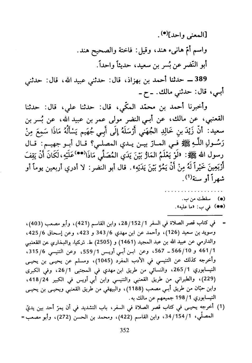 ح وَأَخْبَرَنَا أَحْمَدُ بْنُ مُحَمَّدٍ الْمَكِّيُّ، قَالَ: حَدَّثَنَا عَلِيٌّ، قَالَ: حَدَّثَنَا الْقَعْنَبِيُّ، عَنْ مَالِكٍ، عَنْ أَبِي النَّضْرِ مَوْلَى عُمَرَ بْنِ عُبَيْدِ اللَّهِ، عَنْ بُسْرِ بْنِ سَعِيدٍ أَنَّ زَيْدَ بْنَ خَالِدٍ الْجُهَنِيَّ أَرْسَلَهُ إِلَى أَبِي جُهَيْمٍ يَسْأَلُهُ، مَاذَا سَمِعَ مِنْ رَسُولِ اللَّهِ صَلَّى اللَّهُ عَلَيْهِ وَسَلَّمَ فِي الْمَارِّ بَيْنَ يَدَيِ الْمُصَلِّي؟ قَالَ أَبُو جُهَيْمٍ: قَالَ رَسُولُ اللَّهِ صَلَّى اللَّهُ عَلَيْهِ وَسَلَّمَ: «لَوْ يَعْلَمُ الْمَارُّ بَيْنَ يَدَيِ الْمُصَلِّي مَاذَا عَلَيْهِ لَكَانَ أَنْ يَقِفَ أَرْبَعِينَ خَيْرًا لَهُ مِنْ أَنْ يَمُرَّ بَيْنَ يَدَيْهِ».