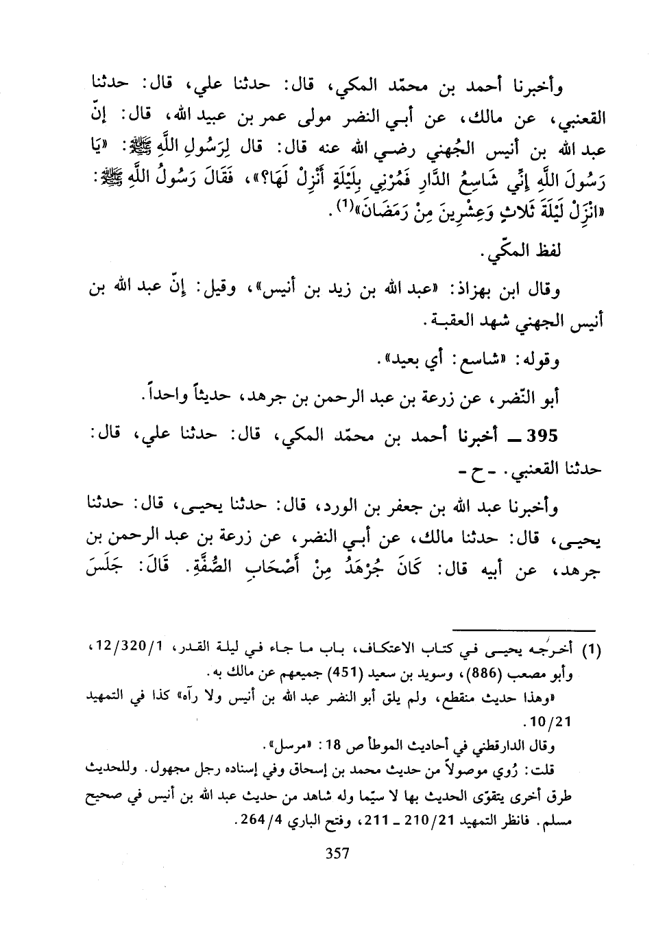 وَأَخْبَرَنَا أَحْمَدُ بْنُ مُحَمَّدٍ الْمَكِّيُّ، قَالَ: حَدَّثَنَا عَلِيٌّ، قَالَ: حَدَّثَنَا الْقَعْنَبِيُّ، عَنْ مَالِكٍ، عَنْ أَبِي النَّضْرِ مَوْلَى عُمَرَ بْنِ عُبَيْدِ اللَّهِ، قَالَ: إِنَّ عَبْدَ اللَّهِ بْنَ أُنَيْسٍ الْجُهَنِيَّ رَضِيَ اللَّهُ عَنْهُ، قَالَ: قَالَ لِرَسُولِ اللَّهِ صَلَّى اللَّهُ عَلَيْهِ وَسَلَّمَ: يَا رَسُولَ اللَّهِ إِنِّي شَاسِعُ الدَّارِ فَمُرْنِي بِلَيْلَةٍ أَنْزِلُ لَهَا؟ "، فَقَالَ رَسُولُ اللَّهِ صَلَّى اللَّهُ عَلَيْهِ وَسَلَّمَ: «انْزِلْ لَيْلَةَ ثَلاثٍ وَعِشْرِينَ مِنْ رَمَضَانَ».