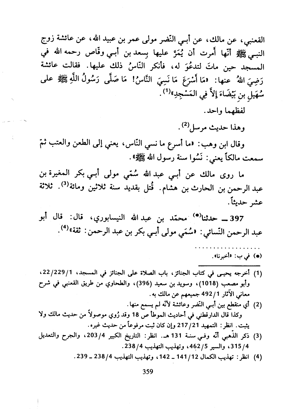 الْقَعْنَبِيُّ، عَنْ مَالِكٍ، عَنْ أَبِي النَّضْرِ مَوْلَى عُمَرَ بْنِ عُبَيْدِ اللَّهِ، عَنْ عَائِشَةَ زَوْجِ النَّبِيِّ صَلَّى اللَّهُ عَلَيْهِ وَسَلَّمَ: أَنَّهَا أَمَرَتْ أَنْ يُمَرَّ عَلَيْهَا بِسَعْدِ بْنِ أَبِي وَقَّاصٍ رَحِمَهُ اللَّهُ فِي الْمَسْجِدِ حِينَ مَاتَ لِتَدْعُوَ لَهُ، فَأَنْكَرَ النَّاسُ ذَلِكَ عَلَيْهَا، فَقَالَتْ عَائِشَةُ رَضِيَ اللَّهُ عَنْهَا: «مَا أَسْرَعَ مَا نَسِيَ النَّاسُ! مَا صَلَّى رَسُولُ اللَّهِ صَلَّى اللَّهُ عَلَيْهِ وَسَلَّمَ عَلَى سُهَيلِ بْنِ بَيْضَاءَ إِلا فِي الْمَسْجِدِ».