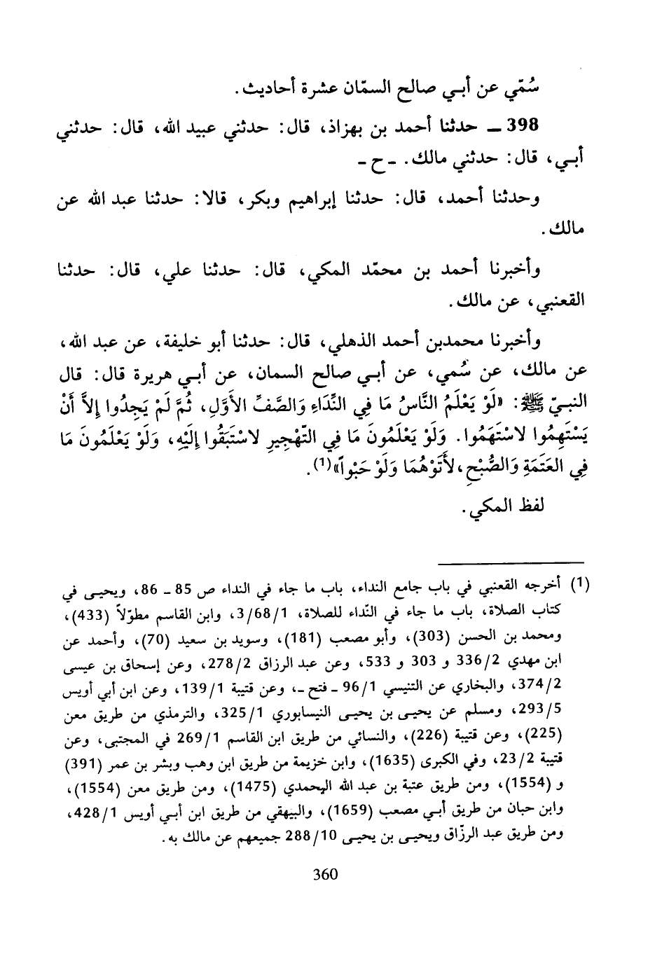 وَأَخْبَرَنَا مُحَمَّدُ بْنُ أَحْمَدَ الذُّهْلِيُّ، قَالَ: حَدَّثَنَا أَبُو خَلِيفَةَ، عَنْ عَبْدِ اللَّهِ، عَنْ مَالِكٍ، عَنْ سُمَيٍّ، عَنْ أَبِي الصَّالِحِ السَّمَّانِ، عَنْ أَبِي هُرَيْرَةَ، قَالَ: قَالَ النَّبِيُّ صَلَّى اللَّهُ عَلَيْهِ وَسَلَّمَ: «لَوْ يَعْلَمُ النَّاسَ مَا فِي النِّدَاءِ وَالصَفِّ الأَوَّلِ، ثُمَّ لَمْ يَجِدُوا إِلا أَنْ يَسْتَهِمُوا لاسْتَهَمُوا، وَلَوْ يَعْلَمُونَ مَا فِي التَّهْجِيرِ لاسْتَبَقُوا إِلَيْهِ، وَلَوْ يَعْلَمُونَ مَا فِي الْعَتَمَةِ وَالصُّبْحِ، لأَتَوْهُمَا وَلَوْ حَبْوًا».