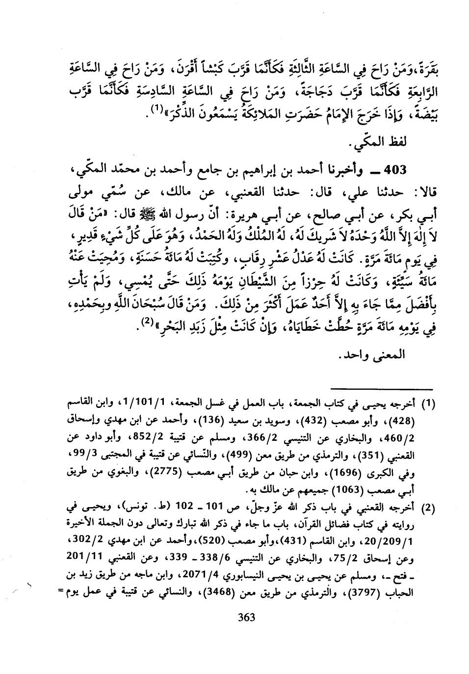 403 - وَأَخْبَرَنَا أَحْمَدُ بْنُ إِبْرَاهِيمَ بْنِ جَامِعٍ، وَأَحْمَدُ بْنُ مُحَمَّدٍ الْمَكِّيُّ قَالا: حَدَّثَنَا عَلِيٌّ، قَالَ: حَدَّثَنَا الْقَعْنَبِيُّ، عَنْ مَالِكٍ، عَنْ سُمَيٍّ مَوْلَى أَبِي بَكْرٍ، عَنْ أَبِي صَالِحٍ، عَنْ أَبِي هُرَيْرَةَ، أَنَّ رَسُولَ اللَّهِ صَلَّى اللَّهُ عَلَيْهِ وَسَلَّمَ، قَالَ: " مَنْ قَالَ: لا إِلَهَ إِلا اللَّهُ وَحْدَهُ لا شَرِيكَ لَهُ، لَهُ الْمُلْكُ وَلَهُ الْحَمْدُ، وَهُوَ عَلَى كُلِّ شَيْءٍ قَدِيرٌ، فِي يَوْمٍ مِائَةَ مَرَّةٍ، كَانَتْ لَهُ عَدْلَ عَشْرِ رِقَابٍ، وَكُتِبَتْ لَهُ مِائَةُ حَسَنَةٍ، وَمُحِيَتْ عَنْهُ مِائَةُ سَيِّئَةٍ، وَكَانَتْ لَهُ حِرْزًا مِنَ الشَّيْطَانِ يَوْمَهُ ذَلِكَ حَتَّى يُمْسِيَ، وَلَمْ يَأْتِ بِأَفْضَلَ مِمَّا جَاءَ بِهِ إِلا أَحَدٌ عَمِلَ أَكْثَرَ مِنْ ذَلِكَ.