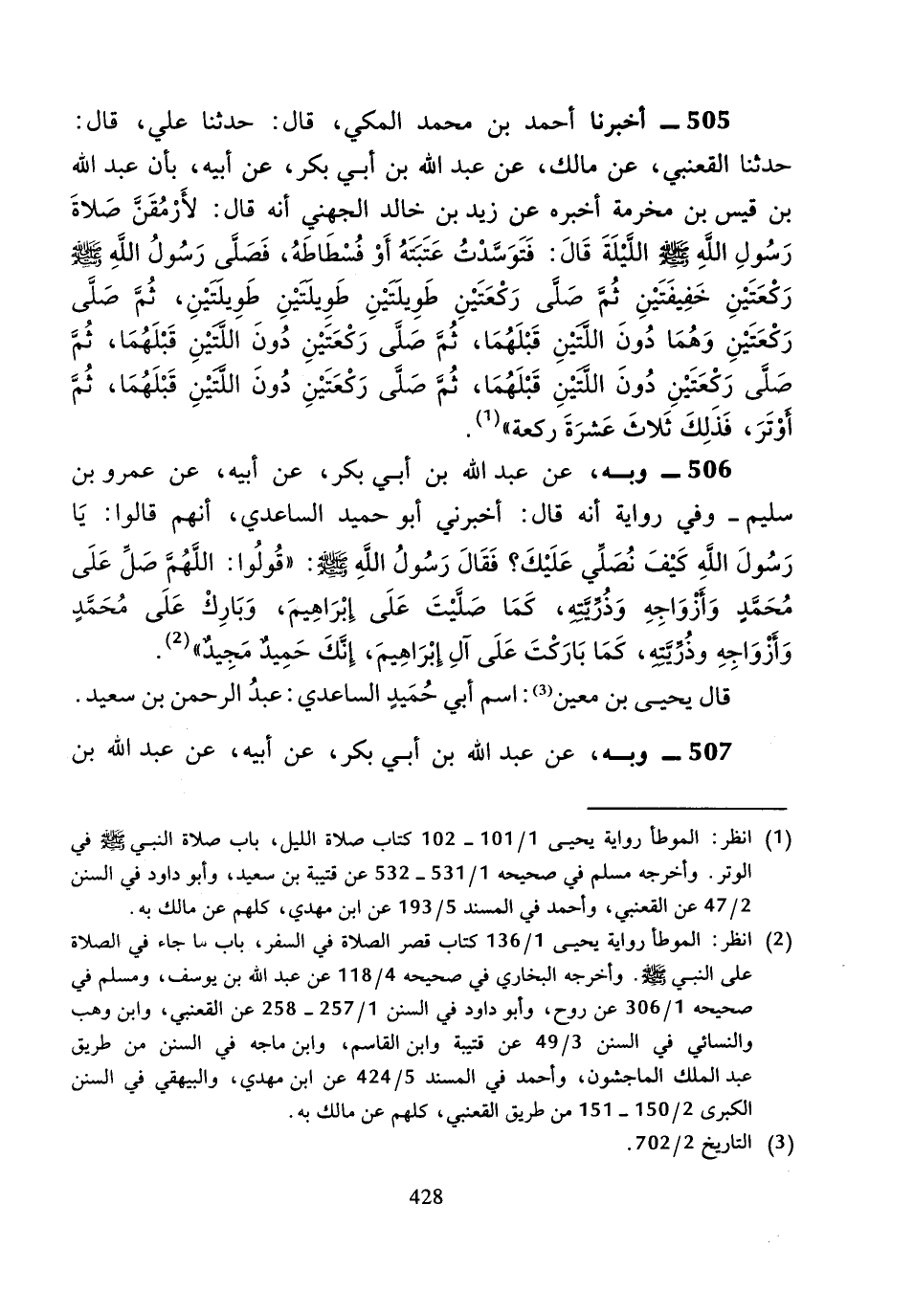 506 - وَبِهِ، عَنْ عَبْدِ اللَّهِ بْنِ أَبِي بَكْرٍ، عَنْ أَبِيهِ، عَنْ عَمْرِو بْنِ سُلَيْمٍ، وَفِي رِوَايَةِ أَنَّهُ قَالَ: أَخْبَرَنِي أَبُو حُمَيْدٍ السَّاعِدِيُّ، أَنَّهُمْ قَالُوا: يَا رَسُولَ اللَّهِ كَيْفَ نُصَلِّي عَلَيْكَ؟ فَقَالَ رَسُولُ اللَّهِ صَلَّى اللَّهُ عَلَيْهِ وَسَلَّمَ: " قُولُوا: اللَّهُمَّ صَلِّ عَلَى مُحَمَّدٍ وَأَزْوَاجِهِ وَذُرِّيَّتِهِ، كَمَا صَلَّيْتَ عَلَى إِبْرَاهِيمَ، وَبَارِكْ عَلَى مُحَمَّدٍ وَأَزْوَاجِهِ وَذُرِّيَّتِهِ، كَمَا بَارَكْتَ عَلَى آلِ إِبْرَاهِيمَ، إِنَّكَ حُمَيْدٌ مَجِيدٌ ".