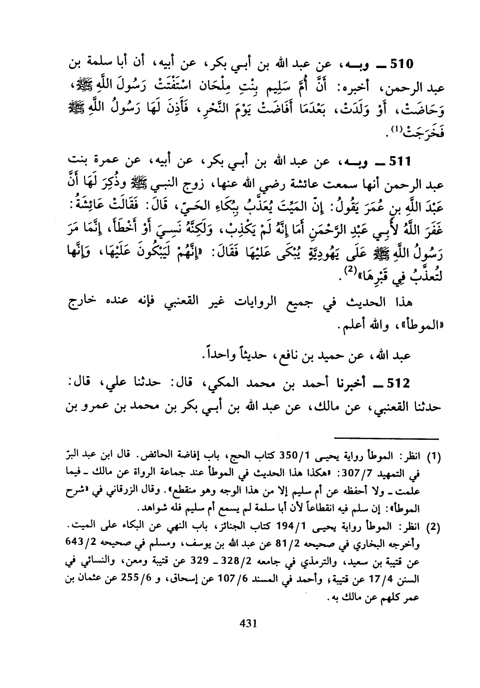 510 - وَبِهِ: عَنْ عَبْدِ اللَّهِ بْنِ أَبِي بَكْرٍ، عَنْ أَبِيهِ، أَنَّ أَبَا سَلَمَةَ بْنَ عَبْدِ الرَّحْمَنِ أَخْبَرَهُ، أَنَّ أُمَّ سُلَيْمَانَ بِنْتَ مِلْحَانَ اسْتَفْتَتْ رَسُولَ اللَّهِ صَلَّى اللَّهُ عَلَيْهِ وَسَلَّمَ، وَحَاضَتْ أَوْ وَلَدَتْ بَعْدَمَا أَفَاضَتْ يَوْمَ النَّحْرِ، فَأَذِنَ لَهَا رَسُولُ اللَّهِ صَلَّى اللَّهُ عَلَيْهِ وَسَلَّمَ فَخَرَجَتْ "