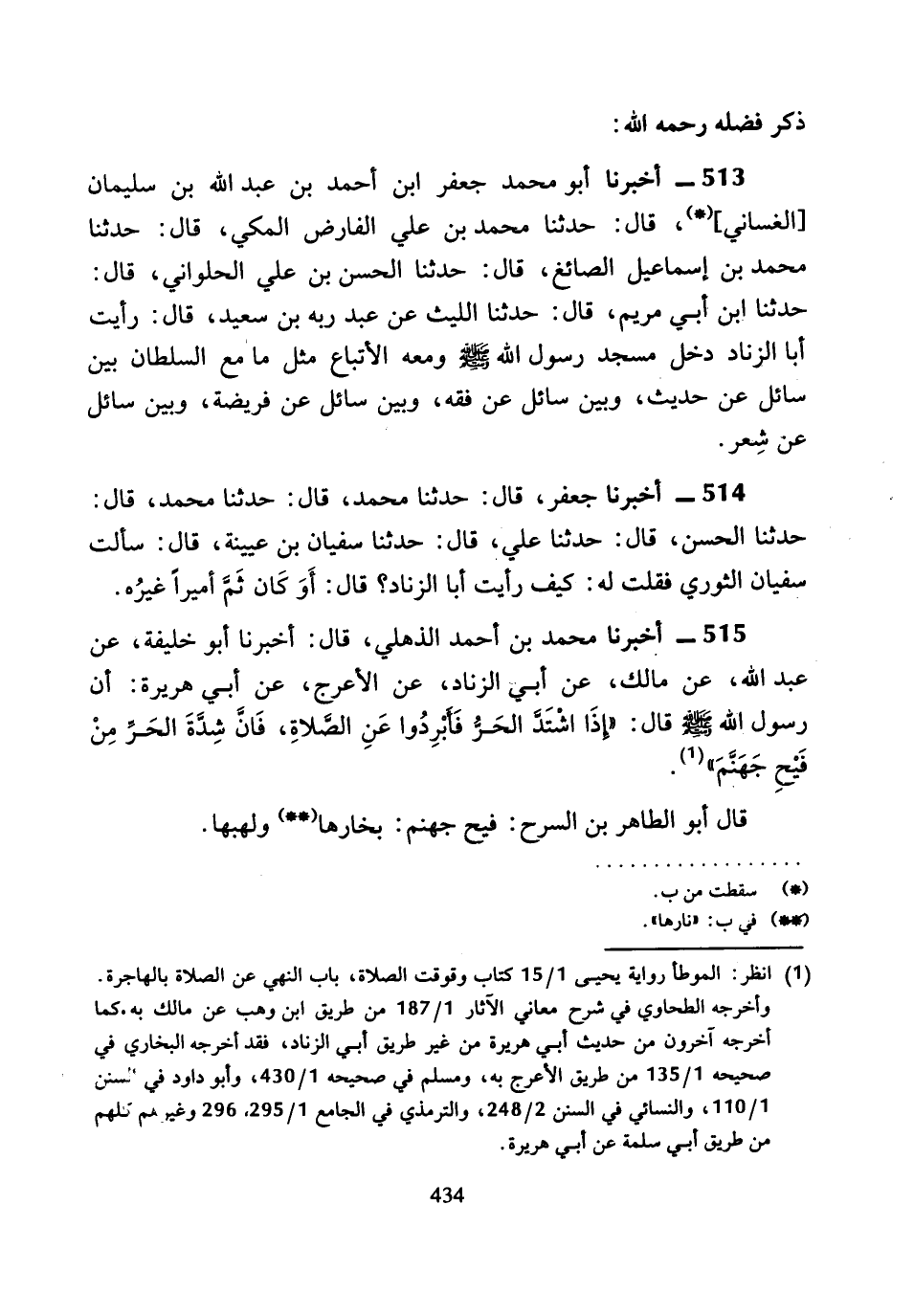 515 - أَخْبَرَنَا مُحَمَّدُ بْنُ أَحْمَدَ الذُّهْلِيُّ، قَالَ: أَخْبَرَنَا أَبُو خَلِيفَةَ، عَنْ عَبْدِ اللَّهِ، عَنْ مَالِكٍ، عَنْ أَبِي الزِّنَادِ، عَنِ الأَعْرَجِ، عَنْ أَبِي هُرَيْرَةَ، أَنَّ رَسُولَ اللَّهِ صَلَّى اللَّهُ عَلَيْهِ وَسَلَّمَ، قَالَ: «إِذَا كَانَ الْحَرُّ فَأَبْرِدُوا عَنِ الصَّلاةِ، فَإِنَّ شِدَّةَ الْحَرِّ مِنْ فَيْحِ جَهَنَّمَ».