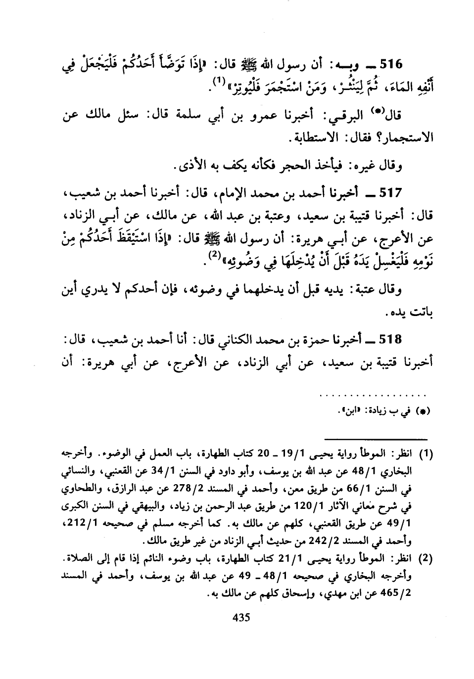 517 - أَخْبَرَنَا أَحْمَدُ بْنُ مُحَمَّدٍ الإِمَامُ، قَالَ: أَخْبَرَنَا أَحْمَدُ بْنُ شُعَيْبٍ، قَالَ: أَخْبَرَنَا قُتَيْبَةُ بْنُ سَعِيدٍ، وَعُتْبَةُ بْنُ عَبْدِ اللَّهِ، عَنْ مَالِكٍ، عَنْ أَبِي الزِّنَادِ، عَنِ الأَعْرَجِ، عَنْ أَبِي هُرَيْرَةَ، أَنَّ رَسُولَ اللَّهِ صَلَّى اللَّهُ عَلَيْهِ وَسَلَّمَ، قَالَ: «إِذَا اسْتَيْقَظَ أَحَدُكُمْ مِنْ نَوْمِهِ فَلْيَغْسِلْ يَدَهُ قَبْلَ أَنْ يُدْخِلَهَا فِي وَضُوئِهِ».