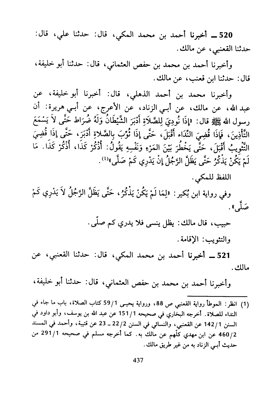 520 - أَخْبَرَنَا أَحْمَدُ بْنُ مُحَمَّدٍ الْمَكِّيُّ، قَالَ: حَدَّثَنَا عَلِيٌّ، قَالَ: حَدَّثَنَا الْقَعْنَبِيُّ، عَنْ مَالِكٍ، وَأَخْبَرَنَا أَحْمَدُ بْنُ مُحَمَّدِ بْنِ حَفْصٍ الْعُثْمَانِيُّ، قَالَ: حَدَّثَنَا أَبُو خَلِيفَةَ، قَالَ: حَدَّثَنَا ابْنُ قَعْنَبٍ، عَنْ مَالِكٍ، وَأَخْبَرَنَا مُحَمَّدُ بْنُ أَحْمَدَ الذُّهْلِيُّ، قَالَ: أَخْبَرَنَا أَبُو خَلِيفَةَ، عَنْ عَبْدِ اللَّهِ، عَنْ مَالِكٍ، عَنْ أَبِي الزِّنَادِ، عَنِ الأَعْرَجِ، عَنْ أَبِي هُرَيْرَةَ، أَنَّ رَسُولَ اللَّهِ صَلَّى اللَّهُ عَلَيْهِ وَسَلَّمَ، قَالَ: " إِذَا نُودِيَ لِلصَّلاةِ أَدْبَرَ الشَّيْطَانُ وَلَهُ ضُرَاطٌ حَتَّى لا يَسْمَعَ التَّأْذِينَ، فَإِذَا قُضِيَ النِّدَاءُ أَقْبَلَ، حَتَّى إِذَا ثُوِّبَ بِالصَّلاةِ أَدْبَرَ، حَتَّى إِذَا قُضِيَ التَّثْوِيبُ أَقْبَلَ، حَتَّى يَخْطِرَ بَيْنَ الْمَرْءِ وَنَفْسِهِ يَقُولُ: اذْكُرْ كَذَا، اذْكُرْ كَذَا.