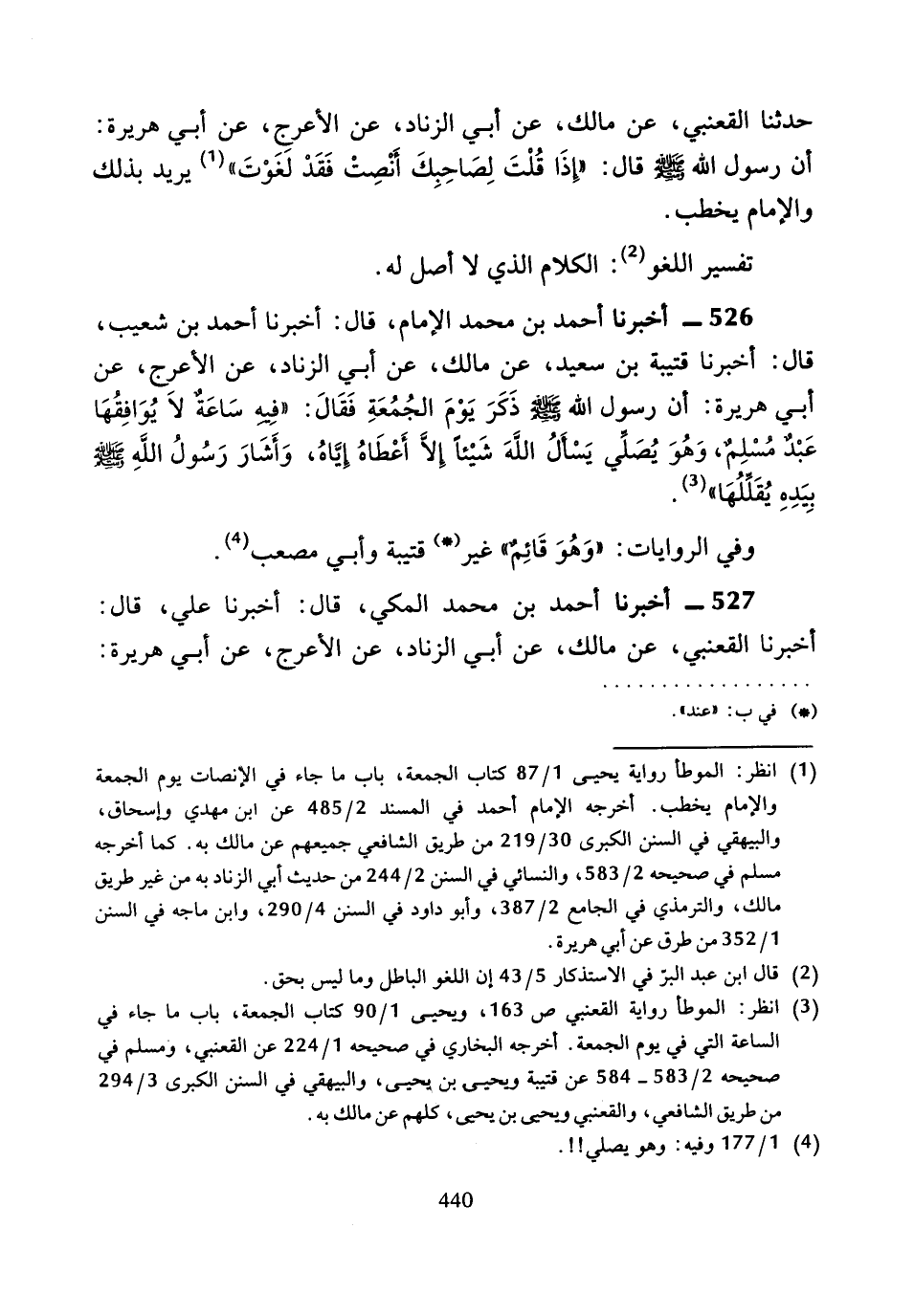 حَدَّثَنَا الْقَعْنَبِيُّ، عَنْ مَالِكٍ، عَنْ أَبِي الزِّنَادِ، عَنِ الأَعْرَجِ، عَنْ أَبِي هُرَيْرَةَ، أَنَّ رَسُولَ اللَّهِ صَلَّى اللَّهُ عَلَيْهِ وَسَلَّمَ، قَالَ: «إِذَا قُلْتَ لِصَاحِبِكَ أَنْصِتْ فَقَدْ لَغَوْتَ».