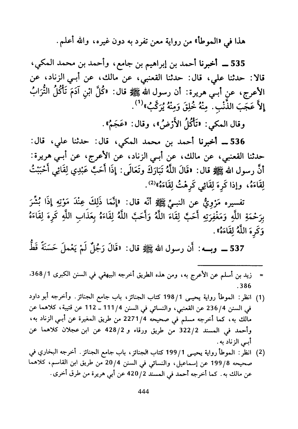 536 - أَخْبَرَنَا أَحْمَدُ بْنُ مُحَمَّدٍ الْمَكِّيُّ، قَالَ: حَدَّثَنَا عَلِيٌّ، قَالَ: حَدَّثَنَا الْقَعْنَبِيُّ، عَنْ مَالِكٍ، عَنْ أَبِي الزِّنَادِ، عَنِ الأَعْرَجِ، عَنْ أَبِي هُرَيْرَةَ، أَنَّ رَسُولَ اللَّهِ صَلَّى اللَّهُ عَلَيْهِ وَسَلَّمَ، قَالَ: قَالَ اللَّهُ تَبَارَكَ وَتَعَالَى: «إِذَا أَحَبَّ عَبْدِي لِقَائِي أَحْبَبْتُ لِقَاءَهُ، وَإِذَا كَرِهَ لِقَائِي كَرِهْتُ لِقَاءَهُ».