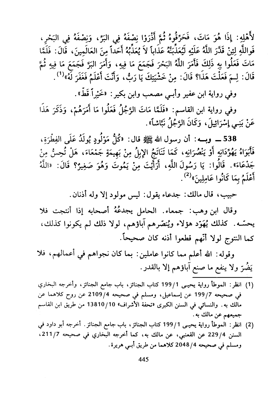 538 - وَبِهِ: أَنَّ رَسُولَ اللَّهِ صَلَّى اللَّهُ عَلَيْهِ وَسَلَّمَ، قَالَ: " كُلُّ مَوْلُودٍ يُولَدُ عَلَى الفِطْرَةِ، فَأَبَوَاهُ يُهَوِّدَانِهِ أَوْ يُنَصِّرَانِهِ، كَمَا تَنَاتَجُ الإِبِلُ مِنْ بَهِيمَةٍ جَمْعَاءَ، هَلْ تُحِسُّ مِنْ جَدْعَاءَ.